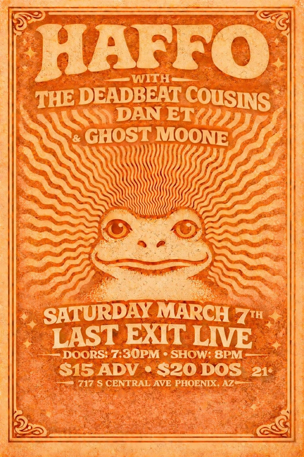 by admin23Feb Haffo at Last Exit Live – Phoenix, AZ Haffo at Last Exit Live – Phoenix, AZ 3 3 people viewed this event. HAFFO w/ special guests The Deadbeat Cousins, Dan E.T., and Ghost Moone Tickets-RSVP Link Date And Time Saturday, March 7th, 2026 08:00 PM (PST) Venue Last Exit Live Location 717 S. Central Ave, Phoenix, AZ 85004 Event Types Concert or PerformanceMusic Event Category ArizonaPhoenix Share With Friends Facebook Twitter Linkedin Xing Pinterest Share This Post: