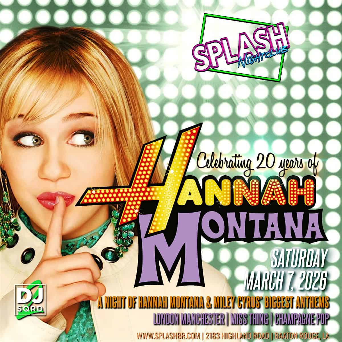 by admin23Feb Hannah Montana / Miley Cyrus Night at SPLASH NIGHTCLUB – Baton Rouge, LA Hannah Montana / Miley Cyrus Night at SPLASH NIGHTCLUB – Baton Rouge, LA 2 2 people viewed this event. Celebrating 20 Years of Hannah Montana Tickets-RSVP Link Date And Time Saturday, March 7th, 2026 @ 09:00 PM Location 2183 Highland Road, Baton Rouge, LA 70802 Event Types Party or Social GatheringPerforming & Visual Arts Event Category Baton RougeLouisiana Share With Friends Facebook Twitter Linkedin Xing Pinterest Share This Post: