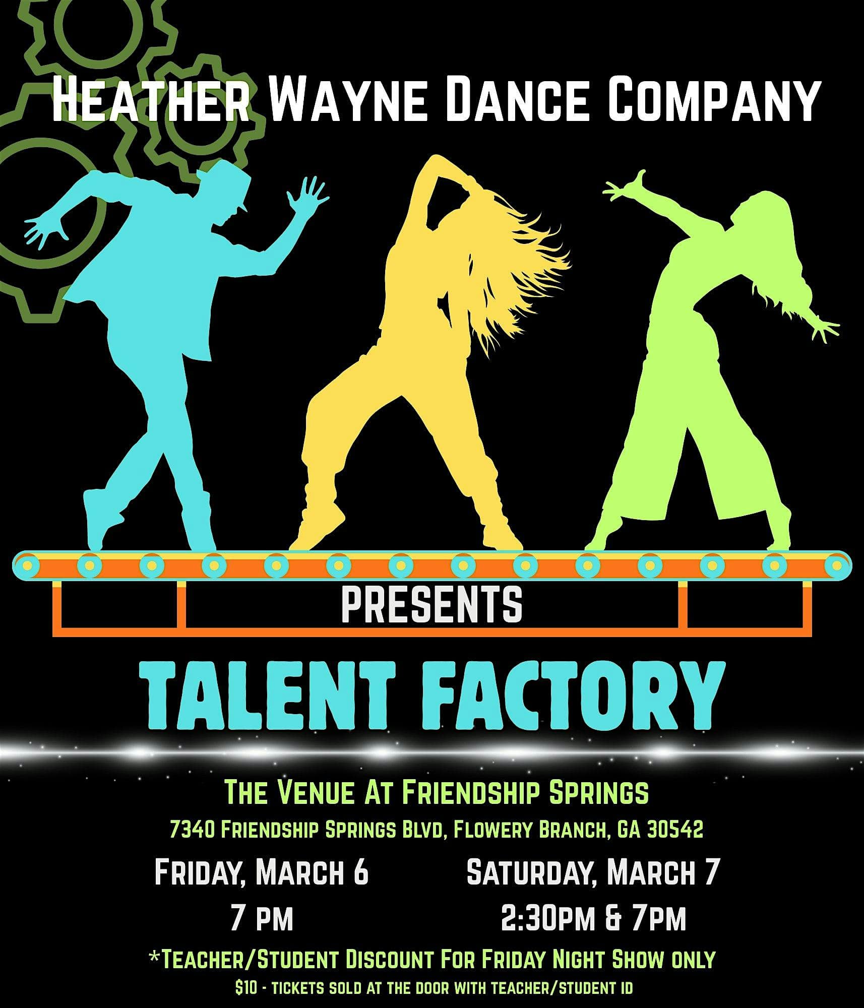 by admin14Feb Heather Wayne Dance Company “The Talent Factory” Sat 3/7/26 @ 2:30pm at The Venue at Friendship Springs, LLC – Flowery Branch, GA Heather Wayne Dance Company “The Talent Factory” Sat 3/7/26 @ 2:30pm at The Venue at Friendship Springs, LLC – Flowery Branch, GA 1 1 people viewed this event. HWDC/ The Talent Factory Showcase features all group and solo competition pieces for the 2026 season. Tickets-RSVP Link Date And Time Saturday, March 7th, 2026 07:00 PM (PST) Venue The Venue at Friendship Springs, LLC Location 7340 Friendship Springs Blvd, Flowery Branch, GA 30542 Event Types Concert or PerformancePerforming & Visual Arts Event Category Georgia Share With Friends Facebook Twitter Linkedin Xing Pinterest Share This Post: