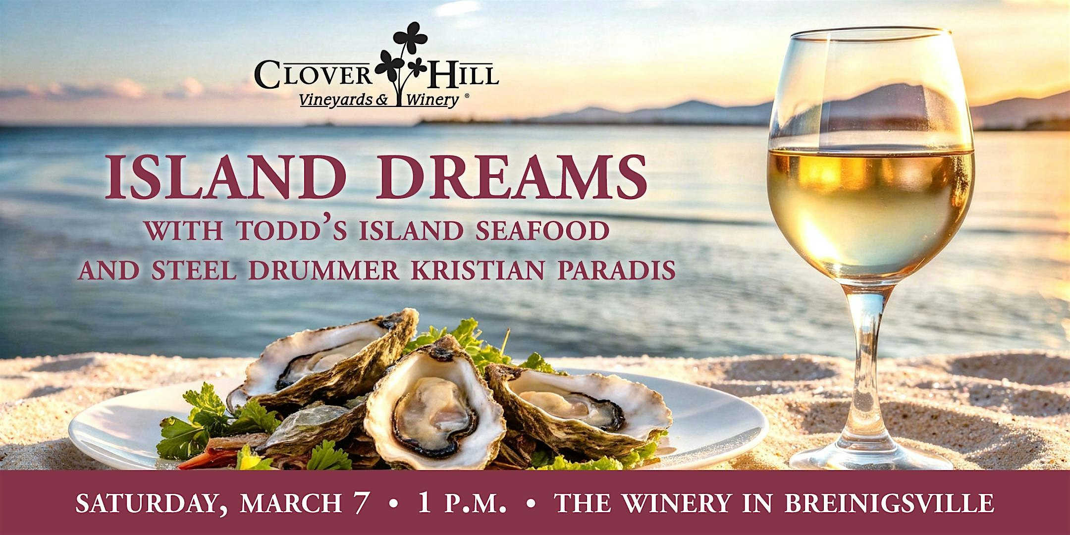 by admin23Feb Island Dreams with Todd’s Island Seafood at The Winery in Breinigsville at Clover Hill Vineyards & Winery – Breinigsville, PA Island Dreams with Todd’s Island Seafood at The Winery in Breinigsville at Clover Hill Vineyards & Winery – Breinigsville, PA 2 2 people viewed this event. Todd’s Island Seafood and steel drummer Kristian Paradis are going to help us chase away the winter blues. Tickets-RSVP Link Date And Time Saturday, March 7th, 2026 01:00 PM (PST) Venue Clover Hill Vineyards & Winery Location 9850 Newtown Road, Breinigsville, PA 18031 Event Types Food & DrinkParty or Social Gathering Event Category Pennsylvania Share With Friends Facebook Twitter Linkedin Xing Pinterest Share This Post: