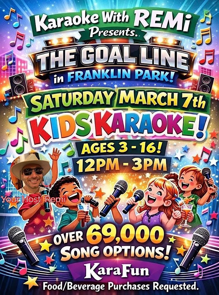 by admin27Feb Kids Karaoke With REMi at The Goal Line in Franklin Park Saturday March 7 at The Goal Line Pizzeria and Sports Bar – Franklin Park, IL Kids Karaoke With REMi at The Goal Line in Franklin Park Saturday March 7 at The Goal Line Pizzeria and Sports Bar – Franklin Park, IL 2 2 people viewed this event. Kids Karaoke is headed back to The Goal Line in Franklin Park for a fun filled day of kids karaoke (ages 3-16) Tickets-RSVP Link Date And Time Saturday, March 7th, 2026 @ 12:00 PM Location 9700 Franklin Avenue, Franklin Park, IL 60131 Event Types Party or Social Gathering Event Category Illinois Share With Friends Facebook Twitter Linkedin Xing Pinterest Share This Post: