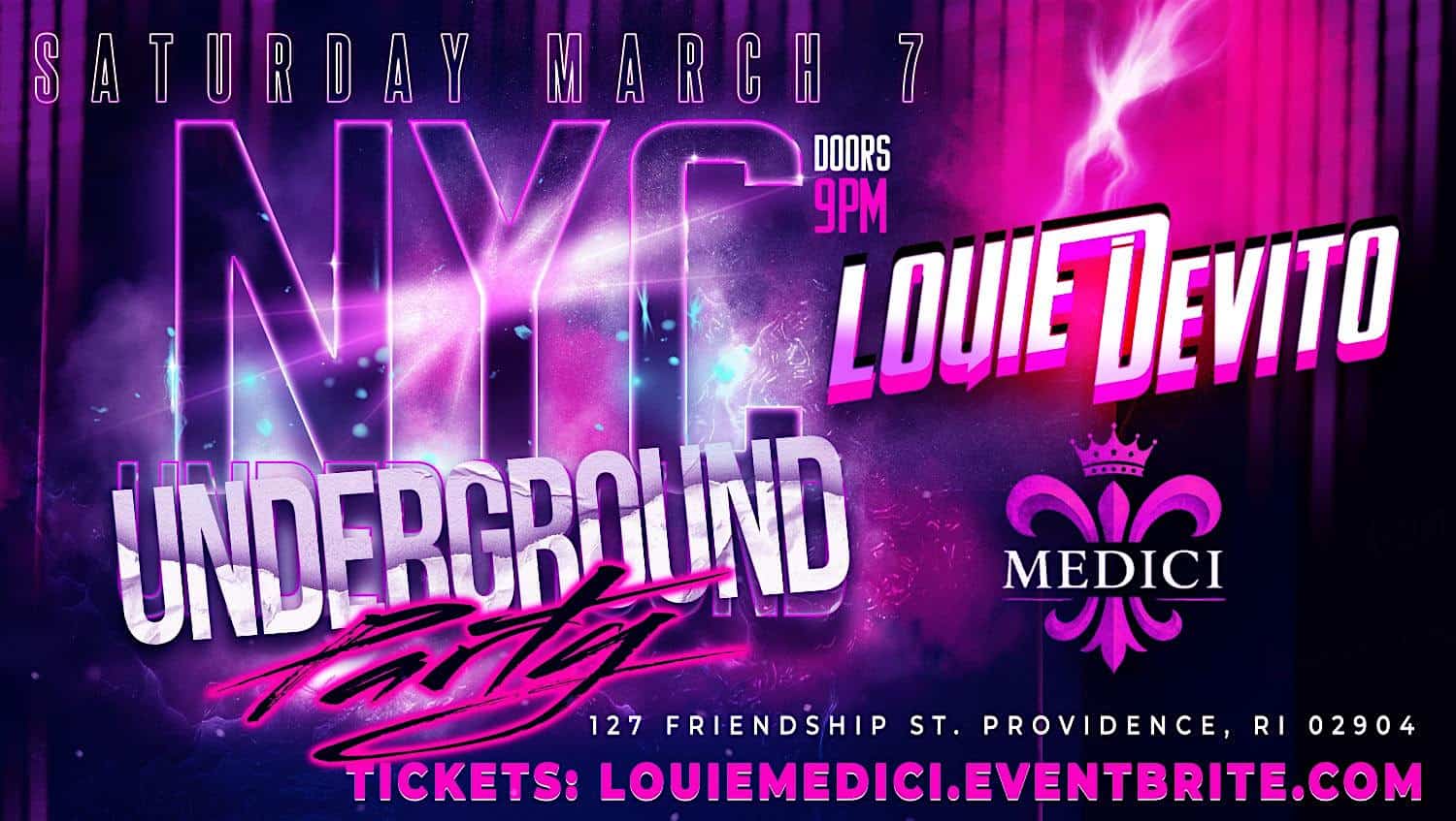 by admin23Feb Louie DeVito’s N.Y.C. Underground Party @ Medici at Medici – Providence, RI Louie DeVito’s N.Y.C. Underground Party @ Medici at Medici – Providence, RI 2 2 people viewed this event. Louie DeVito brings his legendary N.Y.C. Underground Party to Medici in Providence, Rhode Island! Tickets-RSVP Link Date And Time Saturday, March 7th, 2026 @ 09:00 PM Location 127 Friendship Street, Providence, RI 2904 Event Types MusicParty or Social Gathering Event Category ProvidenceRhode Island Share With Friends Facebook Twitter Linkedin Xing Pinterest Share This Post: