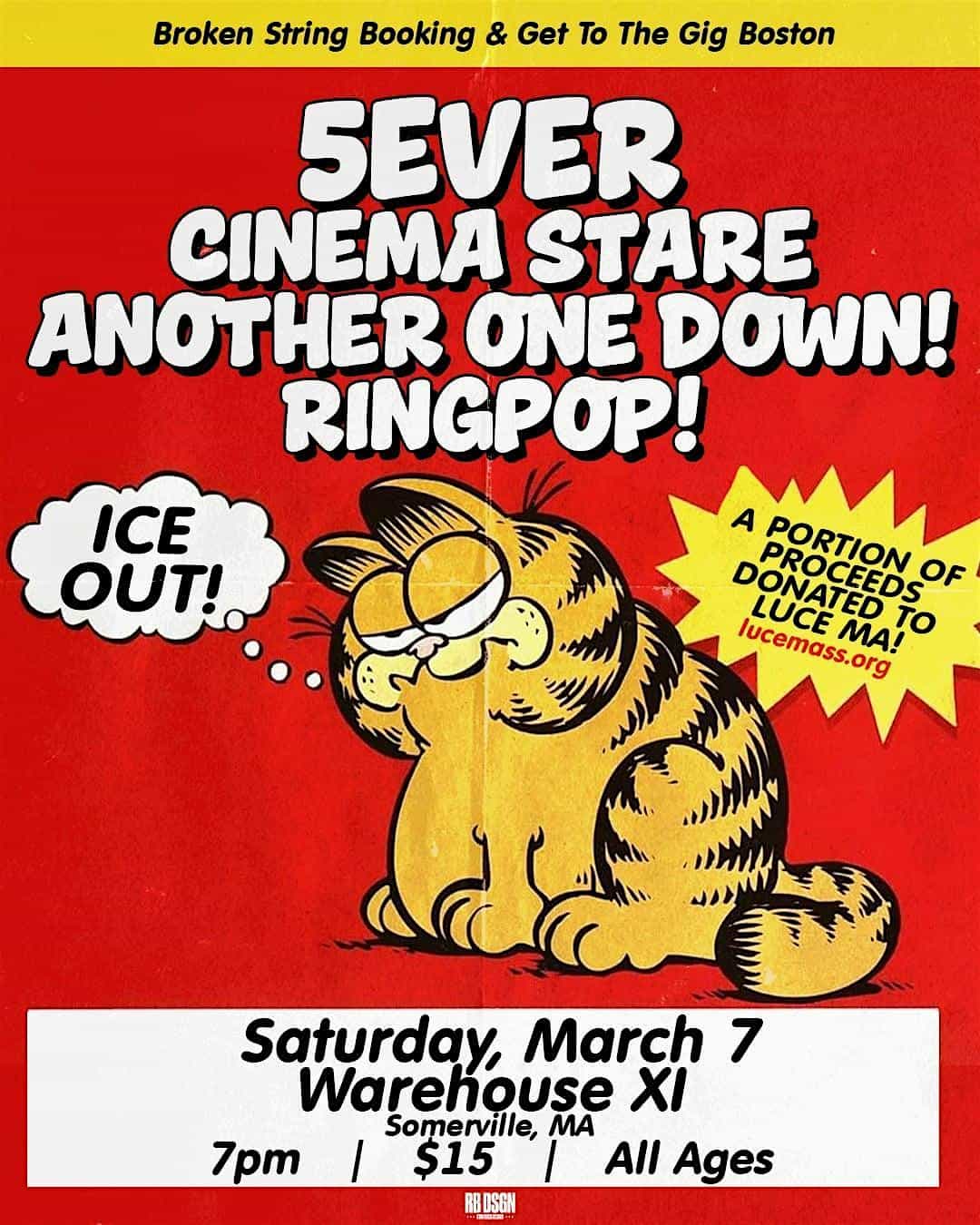 by admin23Feb LUCE FUNDRAISER: 5Ever / Cinema Stare / Another One Down! / Ring Pop! at Warehouse XI – Boston Event Space – Somerville, MA LUCE FUNDRAISER: 5Ever / Cinema Stare / Another One Down! / Ring Pop! at Warehouse XI – Boston Event Space – Somerville, MA 2 2 people viewed this event. BROKEN STRING PRESENTS: A LUCE Fundraiser: Saturday, March 7, 2026 7PM @ Warehouse XI (Somerville, MA) Tickets-RSVP Link Date And Time Saturday, March 7th, 2026 07:00 PM (PST) Venue Warehouse XI - Boston Event Space Location 11 Sanborn Court, Somerville, MA 2143 Event Types Concert or PerformanceMusic Event Category Massachusetts Share With Friends Facebook Twitter Linkedin Xing Pinterest Share This Post: