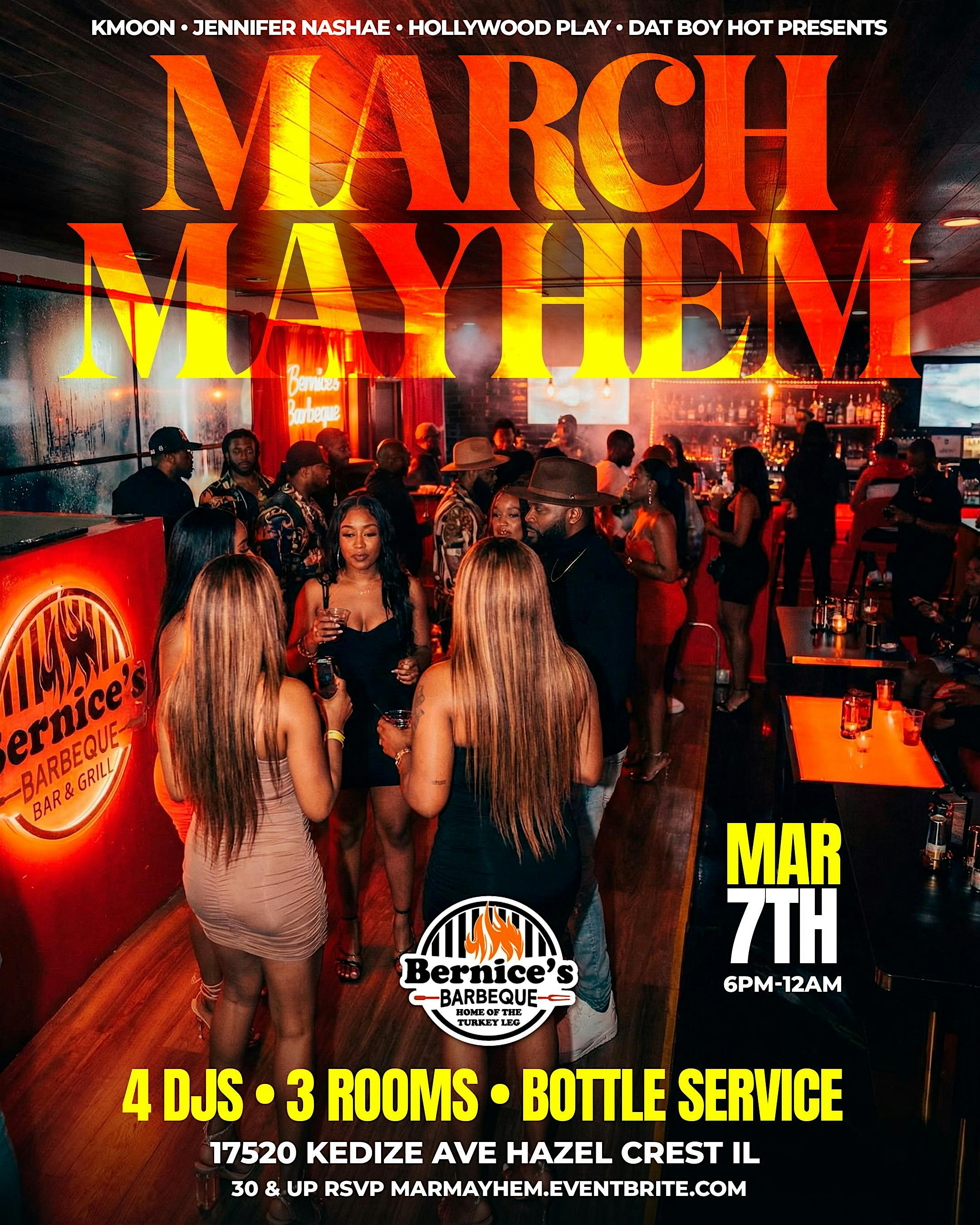 by admin23Feb MARCH MAYHEM at Bernices Barbeque Bar & Grill – Hazel Crest, IL MARCH MAYHEM at Bernices Barbeque Bar & Grill – Hazel Crest, IL 2 2 people viewed this event. Get ready to party with those competitive spirit PISCES at MARCH MAYHEM – it’s going to be a wild ride! Tickets-RSVP Link Date And Time Saturday, March 7th, 2026 06:00 PM (PST) Venue Bernices Barbeque Bar & Grill Location 17520 Kedzie Avenue, Hazel Crest, IL 60429 Event Types MusicParty or Social Gathering Event Category Illinois Share With Friends Facebook Twitter Linkedin Xing Pinterest Share This Post: