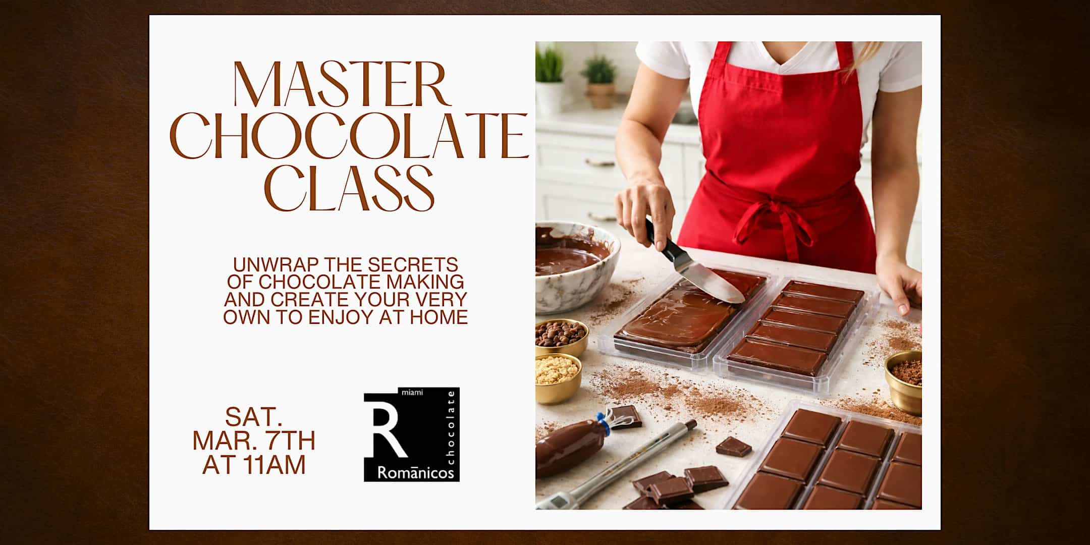 by admin14Feb Master Chocolate Class at Romanicos Chocolate – Miami, FL Master Chocolate Class at Romanicos Chocolate – Miami, FL 2 2 people viewed this event. Unwrap the secrets of chocolate making and create your very own to enjoy at home! Tickets-RSVP Link Date And Time Saturday, March 7th, 2026 04:00 PM (PST) Venue Romanicos Chocolate Location 2337 Coral Way, Miami, FL 33145 Event Types Food & Drink Event Category FloridaMiami Share With Friends Facebook Twitter Linkedin Xing Pinterest Share This Post: