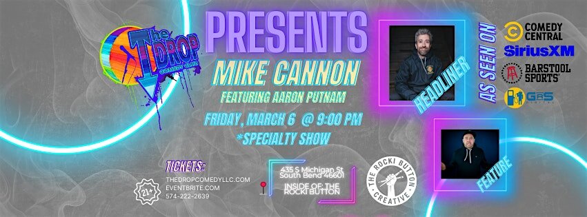 by admin14Feb Mike Cannon Headlines The Drop Comedy Club at The Rocki Button Home of The Drop Comedy Club – South Bend, IN Mike Cannon Headlines The Drop Comedy Club at The Rocki Button Home of The Drop Comedy Club – South Bend, IN 2 2 people viewed this event. Mike Cannon Headlines The Drop Comedy Club featuring Aaron Putnam Tickets-RSVP Link Date And Time Saturday, March 7th, 2026 02:00 AM (PST) Venue The Rocki Button Home of The Drop Comedy Club Location 435 South Michigan Street, South Bend, IN 46601 Event Types Concert or PerformanceFilm, Media & Entertainment Event Category Indiana Share With Friends Facebook Twitter Linkedin Xing Pinterest Share This Post: