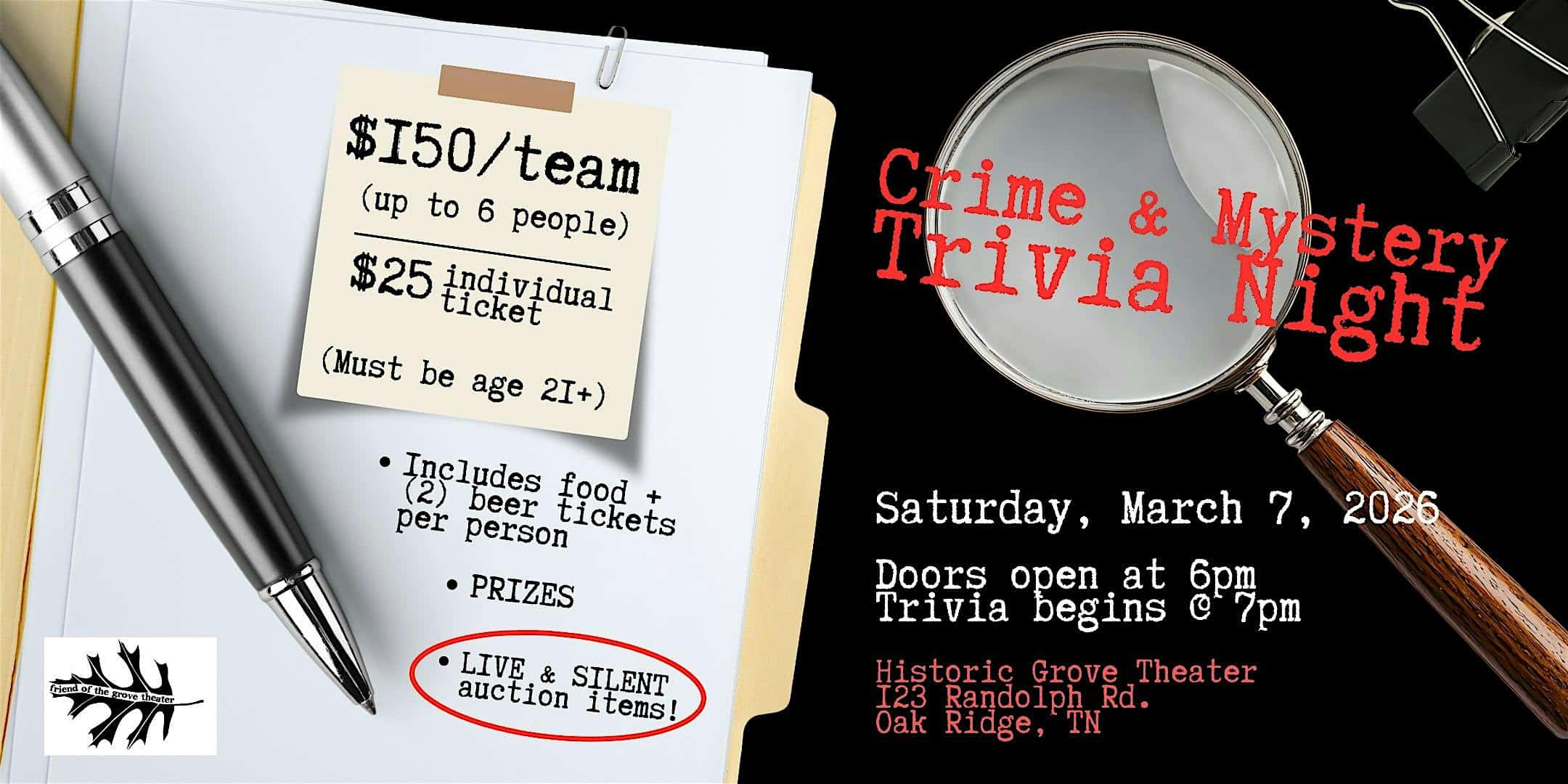 by admin23Feb Mystery Crime Trivia Night at Historic Grove Theater – Oak Ridge, TN Mystery Crime Trivia Night at Historic Grove Theater – Oak Ridge, TN 3 3 people viewed this event. A mystery & crime-themed trivia night in support of the Friends of the Grove Theater in Oak Ridge. Tickets-RSVP Link Date And Time Saturday, March 7th, 2026 @ 07:00 PM Location 123 Randolph Road, Oak Ridge, TN 37830 Event Types Community & CultureParty or Social Gathering Event Category KnoxvilleTennessee Share With Friends Facebook Twitter Linkedin Xing Pinterest Share This Post: