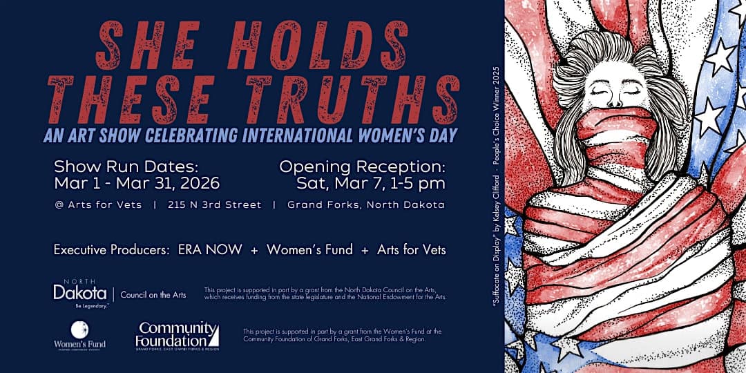 by admin23Feb Opening Reception for ‘She Holds These Truths’ at 215 N 3rd St – Grand Forks, ND Opening Reception for ‘She Holds These Truths’ at 215 N 3rd St – Grand Forks, ND 1 1 people viewed this event. An Art Show Celebrating International Women’s Day Tickets-RSVP Link Date And Time Saturday, March 7th, 2026 @ 01:00 PM Location 215 North 3rd Street, Grand Forks, ND 58203 Event Types Party or Social GatheringPerforming & Visual Arts Event Category North Dakota Share With Friends Facebook Twitter Linkedin Xing Pinterest Share This Post: