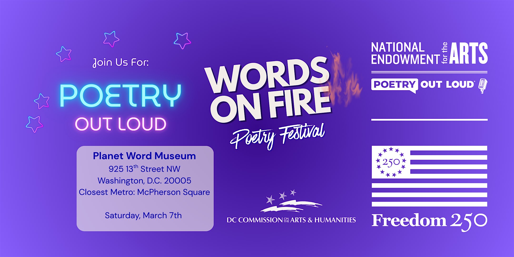by admin05Mar Poetry Out Loud / Words on Fire at Planet Word – Washington, DC Poetry Out Loud / Words on Fire at Planet Word – Washington, DC 1 1 people viewed this event. Come for the competition, stay for the performance Tickets-RSVP Link Date And Time Saturday, March 7th, 2026 11:00 AM (PST) Venue Planet Word Location 925 13th Street Northwest, Washington, DC 20005 Event Types Concert or PerformancePerforming & Visual Arts Event Category Washington DC Share With Friends Facebook Twitter Linkedin Xing Pinterest Share This Post: