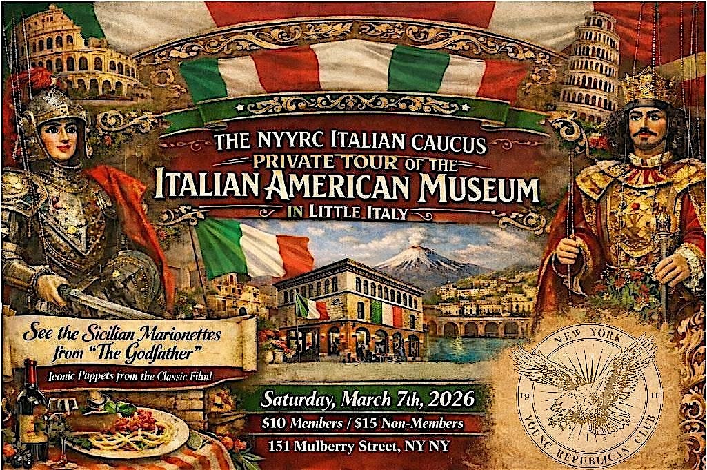 by admin23Feb Private Tour of Italian American Museum at Italian American Museum – New York, NY Private Tour of Italian American Museum at Italian American Museum – New York, NY 2 2 people viewed this event. Join the Italian Caucus as we get a private tour of the Italian American Museum on Mulberry Street Tickets-RSVP Link Date And Time Saturday, March 7th, 2026 01:00 PM (PST) Venue Italian American Museum Location 151 Mulberry Street, New York, NY 10013 Event Types Community & CultureParty or Social Gathering Event Category New YorkNew York City Share With Friends Facebook Twitter Linkedin Xing Pinterest Share This Post: