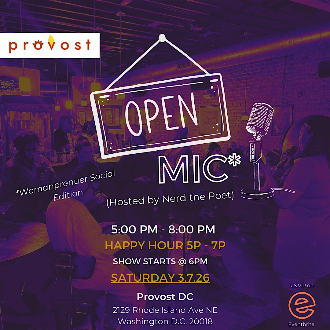 by admin05Mar Pro Voices Open Mic x Womanpreneur Edition @ Provost DC at Provost – Washington, DC Pro Voices Open Mic x Womanpreneur Edition @ Provost DC at Provost – Washington, DC 2 2 people viewed this event. Come join us for a night of powerful voices and great vibes at Pro Voices Open Mic @ Provost DC! Tickets-RSVP Link Date And Time Saturday, March 7th, 2026 05:00 PM (PST) Venue Provost Location 2129 Rhode Island Avenue Northeast, Washington, DC 20018 Event Types Concert or PerformancePerforming & Visual Arts Event Category Washington DC Share With Friends Facebook Twitter Linkedin Xing Pinterest Share This Post: