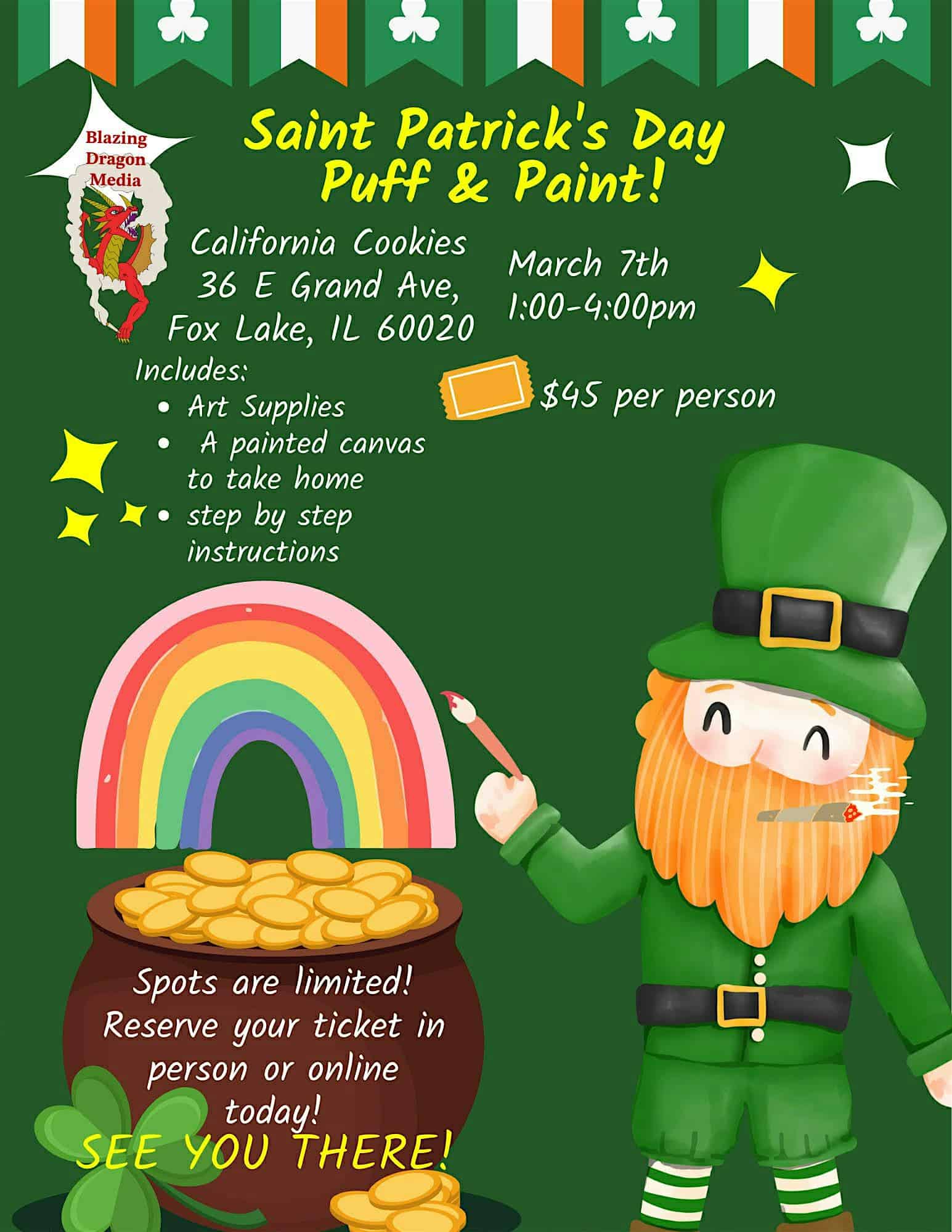 by admin14Feb Puff and Paint at California Cookies at California Cookies – Fox Lake, IL Puff and Paint at California Cookies at California Cookies – Fox Lake, IL 1 1 people viewed this event. Puff, paint & celebrate St. Paddy’s Day! March 7 | 1–4 PM | Fox Lake. $45, supplies included + in-store deals with ticket! Tickets-RSVP Link Date And Time Saturday, March 7th, 2026 07:00 PM (PST) Venue California Cookies Location 36 East Grand Avenue, Fox Lake, IL 60020 Event Types Party or Social Gathering Event Category Illinois Share With Friends Facebook Twitter Linkedin Xing Pinterest Share This Post: