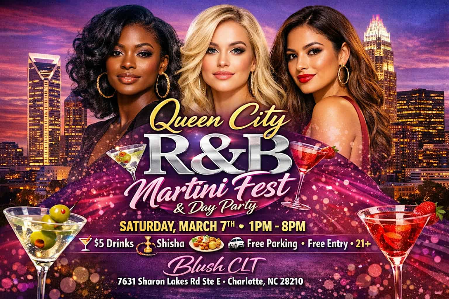 by admin23Feb Queen City R&B Martini Festival at Blush CLT – Charlotte, NC Queen City R&B Martini Festival at Blush CLT – Charlotte, NC 2 2 people viewed this event. Sip smooth martinis and groove to soulful R&B beats at the Queen City R&B Martini Festival! Tickets-RSVP Link Date And Time Saturday, March 7th, 2026 01:00 PM (PST) Venue Blush CLT Location 7631 Sharon Lakes Road, Charlotte, NC 28210 Event Types Festival or FairFood & Drink Event Category CharlotteNorth Carolina Share With Friends Facebook Twitter Linkedin Xing Pinterest Share This Post:
