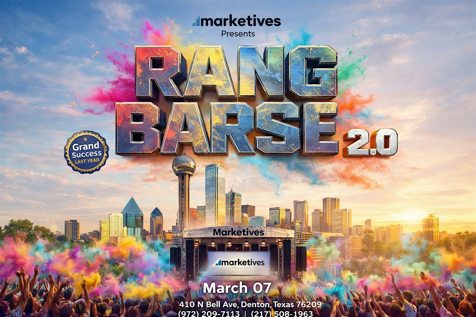 by admin23Feb RANG BARSE 2.0-BOLLY TOLLY MUSIC-MARCH 07-HOLI PARTY 2026-DENTON at 410 N Bell Ave – Denton, TX RANG BARSE 2.0-BOLLY TOLLY MUSIC-MARCH 07-HOLI PARTY 2026-DENTON at 410 N Bell Ave – Denton, TX 3 3 people viewed this event. Get ready to dance the night away with the best of Bollywood and Tollywood music at the ultimate Holi party in Denton! Tickets-RSVP Link Date And Time Saturday, March 7th, 2026 11:00 AM (PST) Venue 410 N Bell Ave Location 410 North Bell Avenue, Denton, TX 76209 Event Types MusicParty or Social Gathering Event Category Texas Share With Friends Facebook Twitter Linkedin Xing Pinterest Share This Post: