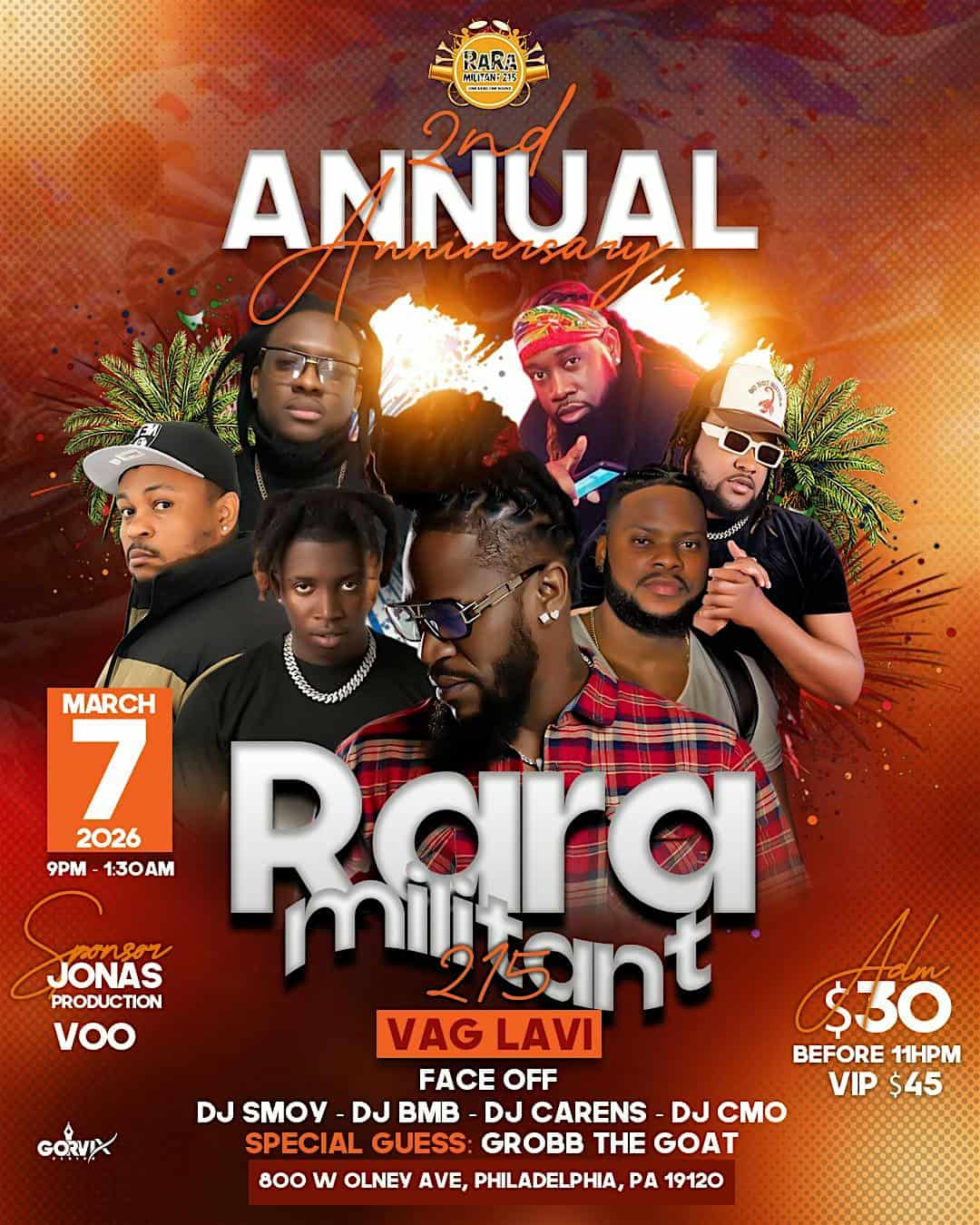 by admin23Feb Rara Militant215 2nd Annual Anniversary at 800 W Olney Ave – Philadelphia, PA Rara Militant215 2nd Annual Anniversary at 800 W Olney Ave – Philadelphia, PA 2 2 people viewed this event. Everyone is welcome to celebrate with us on our friendly 2nd annual anniversary event ,which will be good vibes and get to meet good people. Tickets-RSVP Link Date And Time Saturday, March 7th, 2026 09:00 PM (PST) Venue 800 W Olney Ave Location 800 West Olney Avenue, Philadelphia, PA 19120 Event Types MusicParty or Social Gathering Event Category PennsylvaniaPhiladelphia Share With Friends Facebook Twitter Linkedin Xing Pinterest Share This Post: