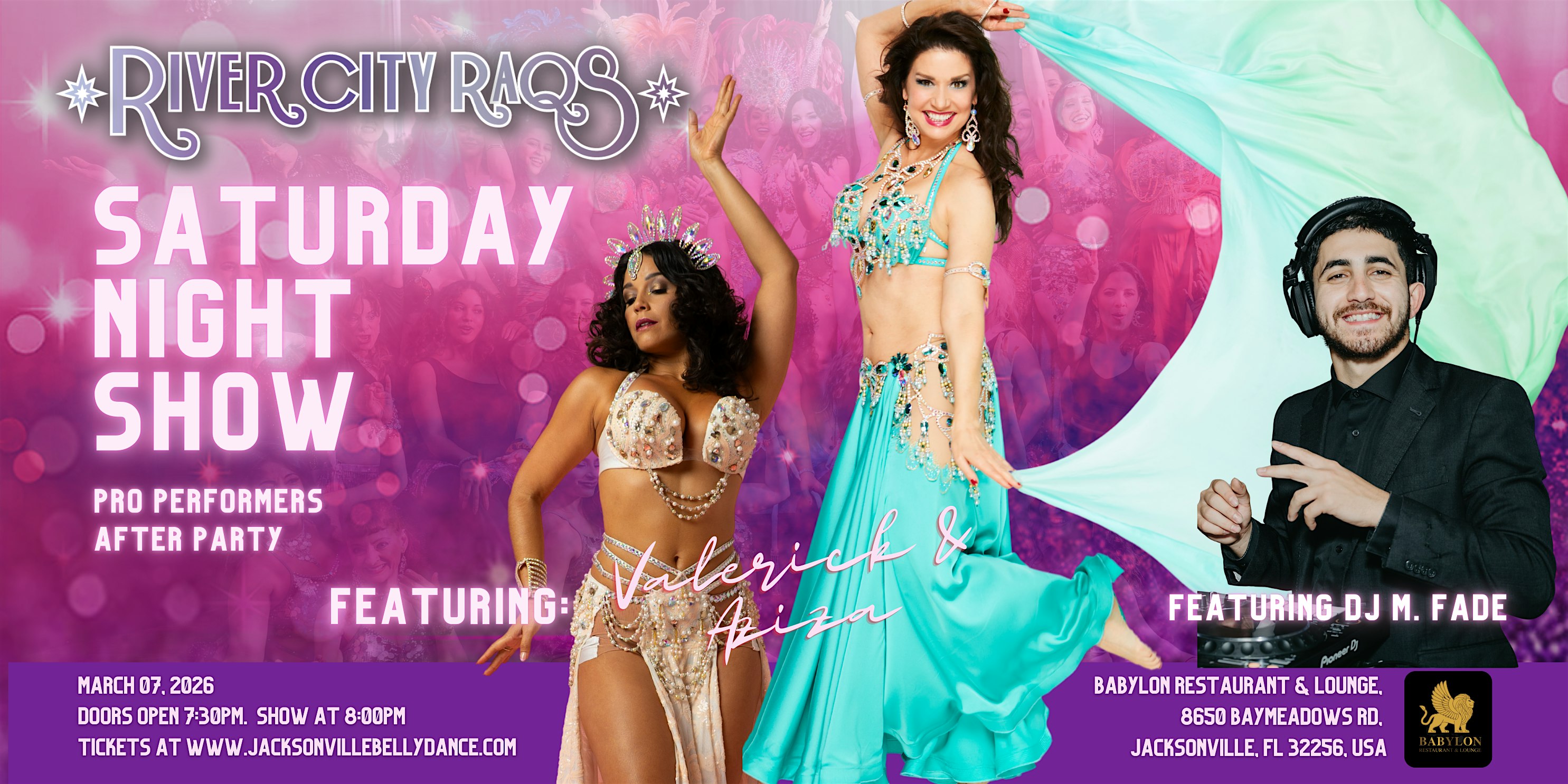 by admin05Mar River City Raqs 2026 “Belly Dance Gala Show” at Babylon Restaurant & lounge – Jacksonville, FL River City Raqs 2026 “Belly Dance Gala Show” at Babylon Restaurant & lounge – Jacksonville, FL 2 2 people viewed this event. River City Raqs 2026 “Belly Dance Gala Show” starring our international belly dance stars! Tickets-RSVP Link Date And Time Saturday, March 7th, 2026 08:00 PM (PST) Venue Babylon Restaurant & lounge Location 8650 Baymeadows Road, Jacksonville, FL 32256 Event Types Concert or PerformancePerforming & Visual Arts Event Category FloridaJacksonville Share With Friends Facebook Twitter Linkedin Xing Pinterest Share This Post: