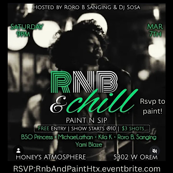 by admin27Feb RNB & Chill Paint Night at 5302 W Orem Dr – Houston, TX RNB & Chill Paint Night at 5302 W Orem Dr – Houston, TX 2 2 people viewed this event. It’s all in the name! Come have a great time and paint! Tickets-RSVP Link Date And Time Saturday, March 7th, 2026 07:00 PM (PST) Venue 5302 W Orem Dr Location 5302 West Orem Drive, Houston, TX 77045 Event Types Music Event Category HoustonTexas Share With Friends Facebook Twitter Linkedin Xing Pinterest Share This Post: