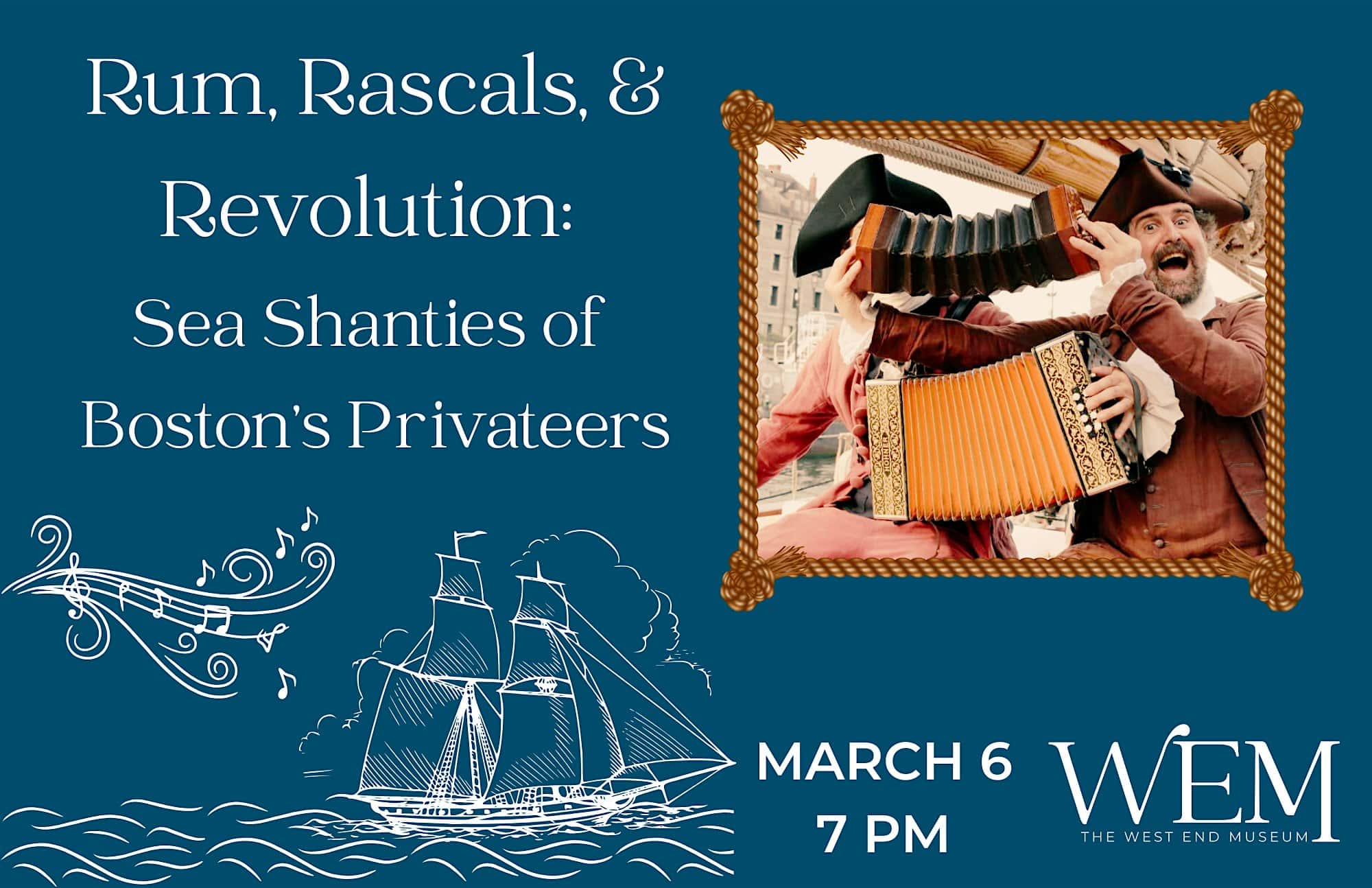 by admin14Feb Rum, Rascals, & Revolution: Sea Shanties of Boston’s Privateers at The West End Museum – Boston, MA Rum, Rascals, & Revolution: Sea Shanties of Boston’s Privateers at The West End Museum – Boston, MA 2 2 people viewed this event. Join us for an evening of pirates, sea shanties, and just a dash of history! The Wellerman comes to the West End with sugar and rum in tow! Tickets-RSVP Link Date And Time Saturday, March 7th, 2026 12:00 AM (PST) Venue The West End Museum Location 150 Staniford St. Suite 7, Boston, MA 2114 Event Types Concert or PerformancePerforming & Visual Arts Event Category BostonMassachusetts Share With Friends Facebook Twitter Linkedin Xing Pinterest Share This Post: