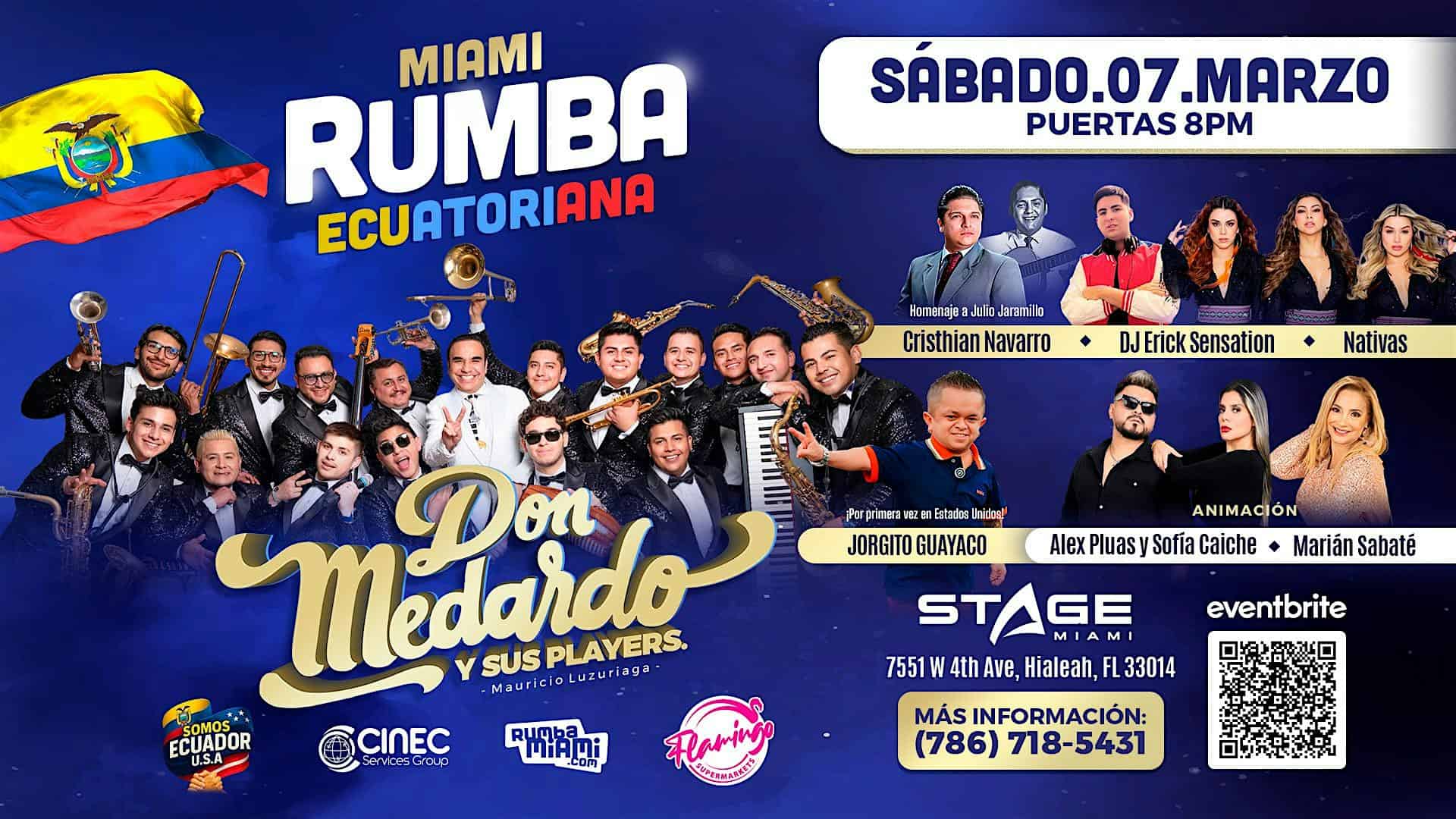 by admin23Feb Rumba Ecuatoriana! Don Medardo y sus Players regresan a Stage MIAMI at Stage Miami – Hialeah, FL Rumba Ecuatoriana! Don Medardo y sus Players regresan a Stage MIAMI at Stage Miami – Hialeah, FL 2 2 people viewed this event. Directo de Ecuador, regresa la emblemática orquesta DON MEDARDO Y SUS PLAYERS: Sábado, 7 de Marzo en STAGE Miami Tickets-RSVP Link Date And Time Saturday, March 7th, 2026 08:00 PM (PST) Venue Stage Miami Location 7551 West 4 Ave, Hialeah, FL 33014 Event Types Concert or PerformanceMusic Event Category Florida Share With Friends Facebook Twitter Linkedin Xing Pinterest Share This Post: