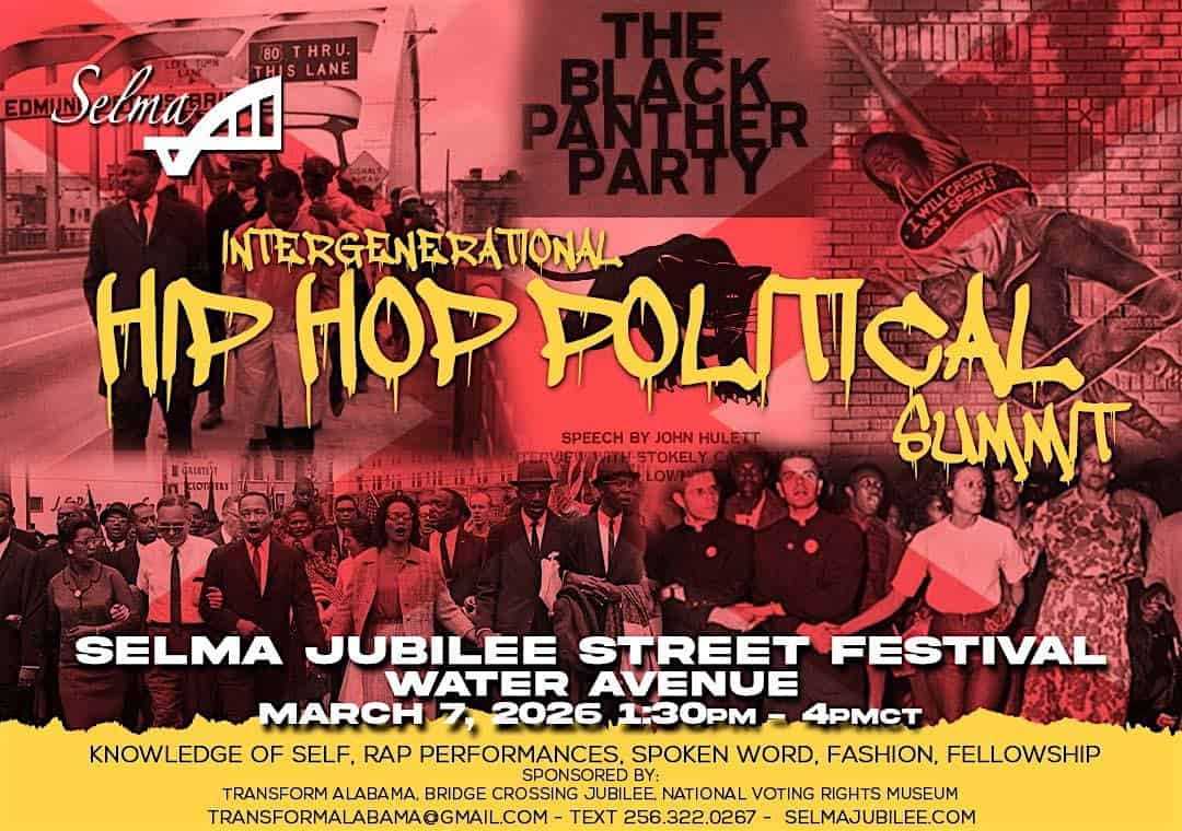 by admin14Feb Selma Intergenerational Hip Hop Political Summit at Water Avenue (Near Lawrence St.) – Selma, AL Selma Intergenerational Hip Hop Political Summit at Water Avenue (Near Lawrence St.) – Selma, AL 2 2 people viewed this event. 61st Selma Bridge Crossing Jubilee Water Avenue Street Festival Tickets-RSVP Link Date And Time Saturday, March 7th, 2026 07:00 PM (PST) Venue Water Avenue (Near Lawrence St.) Location Water Avenue, Selma, AL 36703 Event Types Community & CultureConcert or Performance Event Category Alabama Share With Friends Facebook Twitter Linkedin Xing Pinterest Share This Post:
