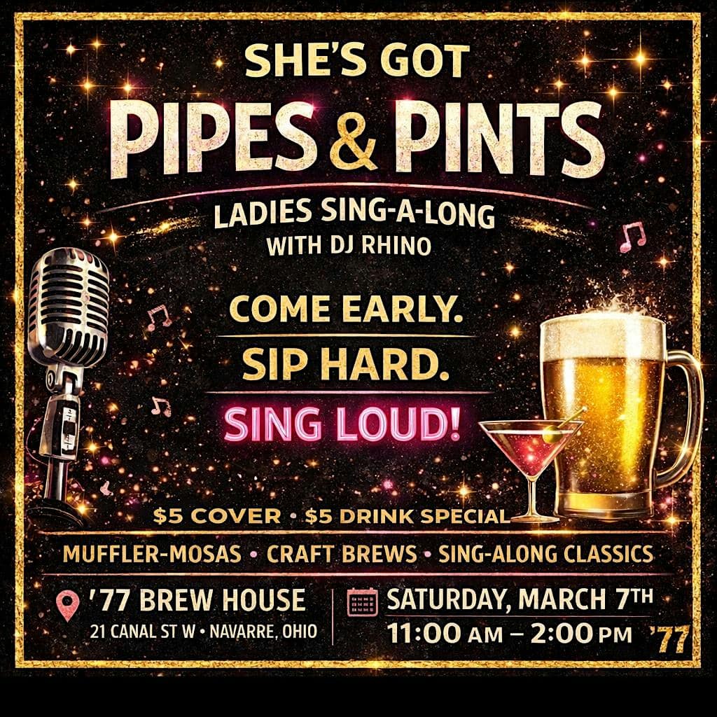 by admin23Feb She’s Got Pipes & Pints at ’77 Brew House – Navarre, OH She’s Got Pipes & Pints at ’77 Brew House – Navarre, OH 1 1 people viewed this event. Warm Up Those Vocals Ladies! Join ’77 Brew House for a morning of ✨Music✨ Muffler-Mosas✨Craft Brews✨Brunch Bites✨Laughs & Good Vibes Tickets-RSVP Link Date And Time Saturday, March 7th, 2026 @ 11:00 AM Location 21 Canal Street West, Navarre, OH 44662 Event Types MusicParty or Social Gathering Event Category Ohio Share With Friends Facebook Twitter Linkedin Xing Pinterest Share This Post: