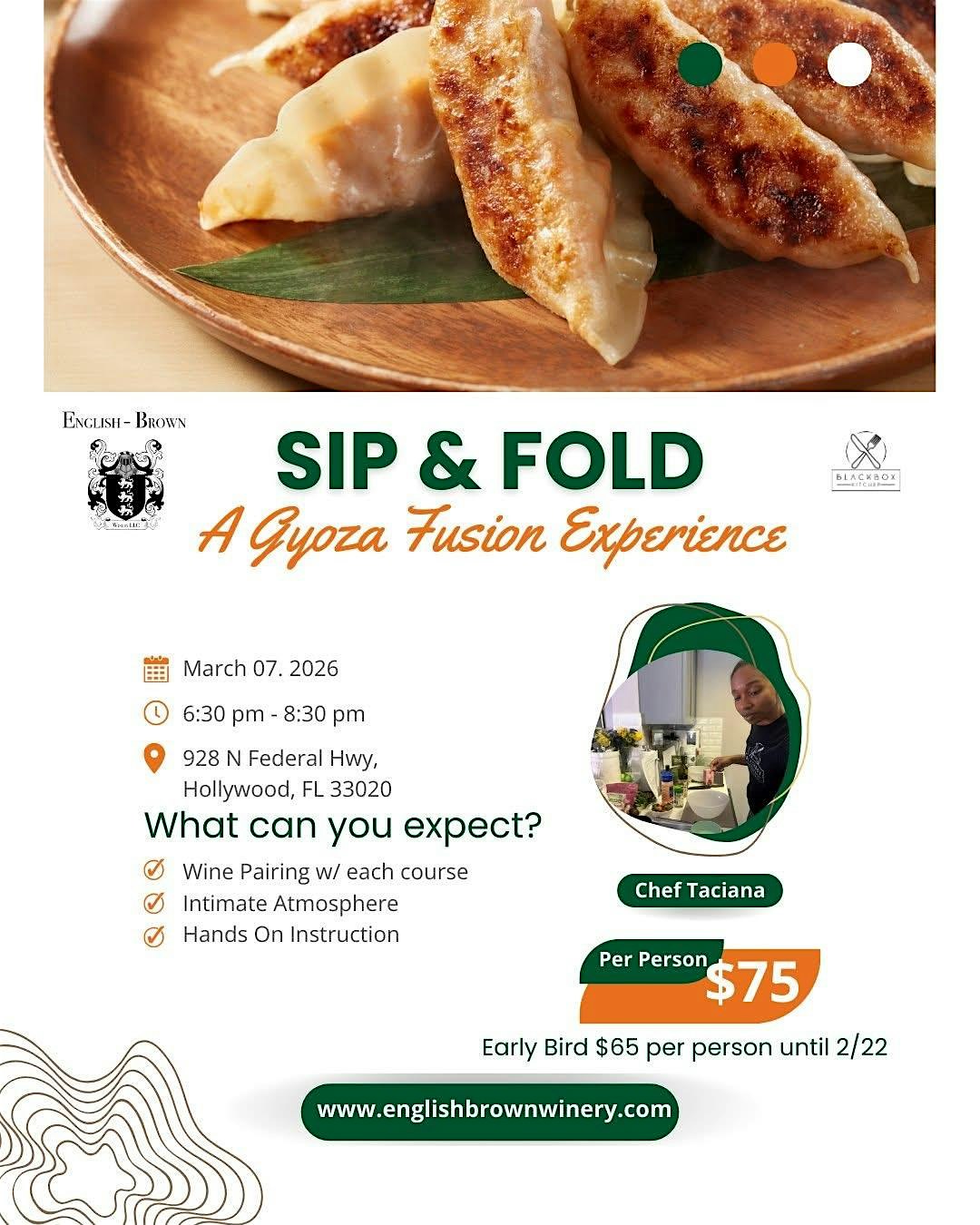 by admin23Feb Sip & Fold: Gyoza Fusion Experience at English-Brown winery – Hollywood, FL Sip & Fold: Gyoza Fusion Experience at English-Brown winery – Hollywood, FL 2 2 people viewed this event. Hands-on gyoza class! Make fresh wrappers, fold traditional cabbage & Latin picadillo dumplings, and enjoy curated wine pairings. Tickets-RSVP Link Date And Time Saturday, March 7th, 2026 06:00 PM (PST) Venue English-Brown winery Location 928 North Federal Highway, Hollywood, FL 33020 Event Types Food & Drink Event Category Florida Share With Friends Facebook Twitter Linkedin Xing Pinterest Share This Post: