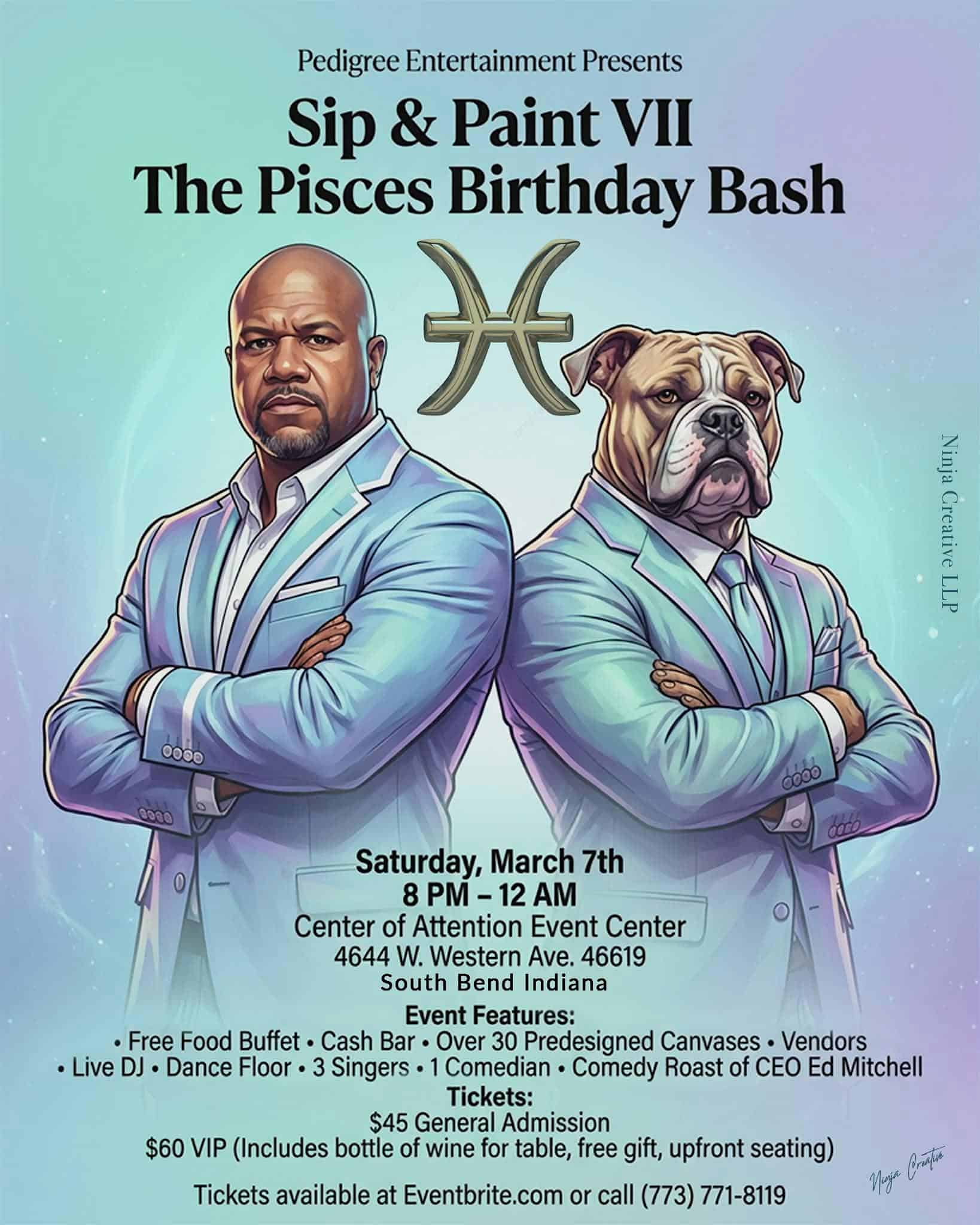 by admin23Feb Sip & Paint VII (Pisces Birthday Bash) at Center of Attention Event Center – South Bend, IN Sip & Paint VII (Pisces Birthday Bash) at Center of Attention Event Center – South Bend, IN 2 2 people viewed this event. Get ready to unleash your inner artist and celebrate Pisces birthdays with a fun Sip & Paint event – creativity and good vibes guaranteed! Tickets-RSVP Link Date And Time Saturday, March 7th, 2026 @ 08:00 PM Location 4644 West Western Avenue, South Bend, IN 46619 Event Types Party or Social GatheringPerforming & Visual Arts Event Category Indiana Share With Friends Facebook Twitter Linkedin Xing Pinterest Share This Post: