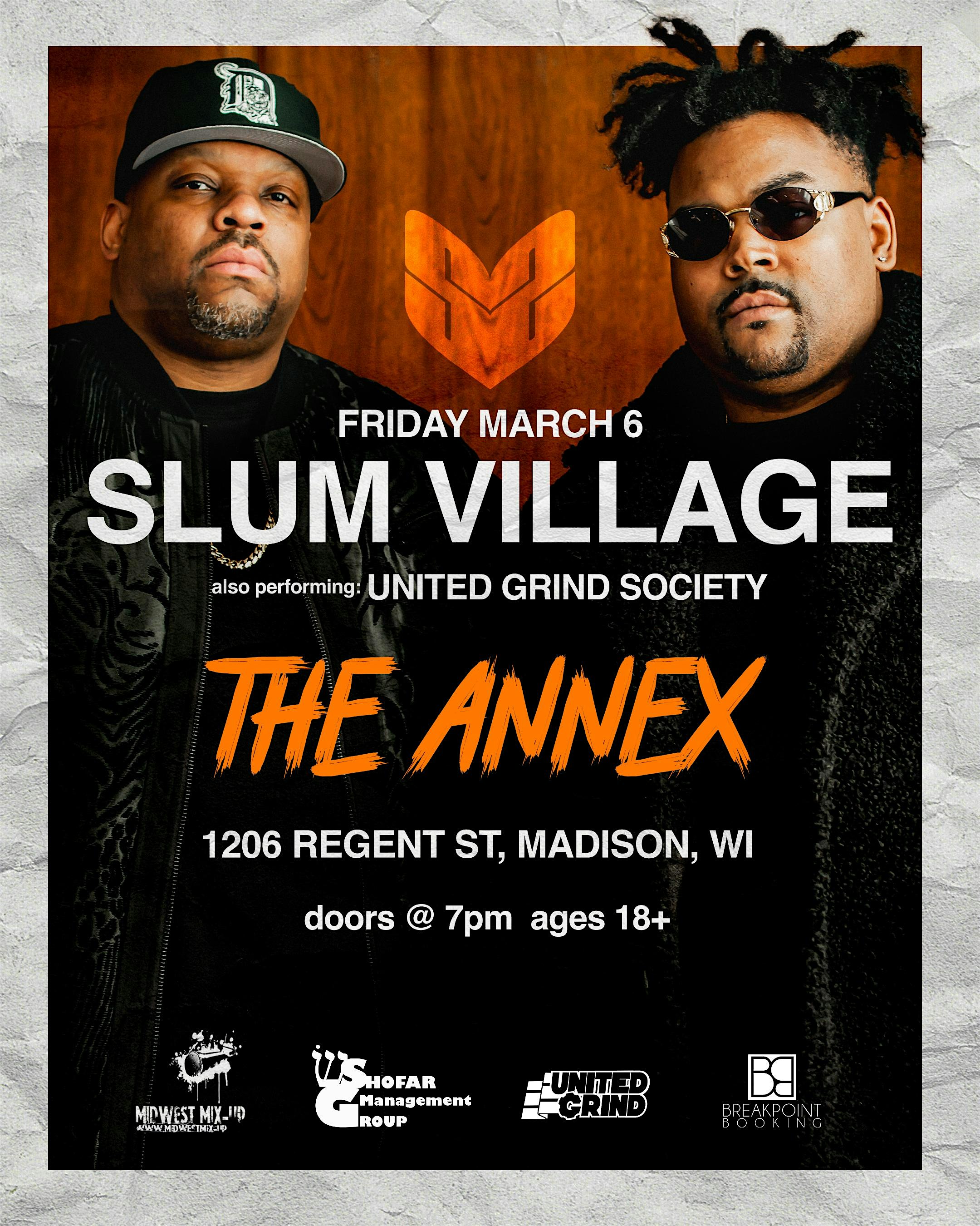 by admin13Feb Slum Village, United Grind Society, Antiii – Gravity & More at The Annex – Madison, WI Slum Village, United Grind Society, Antiii – Gravity & More at The Annex – Madison, WI 1 1 people viewed this event. Slum Village at The Annex! Tickets-RSVP Link Date And Time Saturday, March 7th, 2026 01:00 AM (PST) Venue The Annex Location 1206 Regent St, Madison, WI 53715 Event Types Concert or PerformanceMusic Event Category Wisconsin Share With Friends Facebook Twitter Linkedin Xing Pinterest Share This Post: