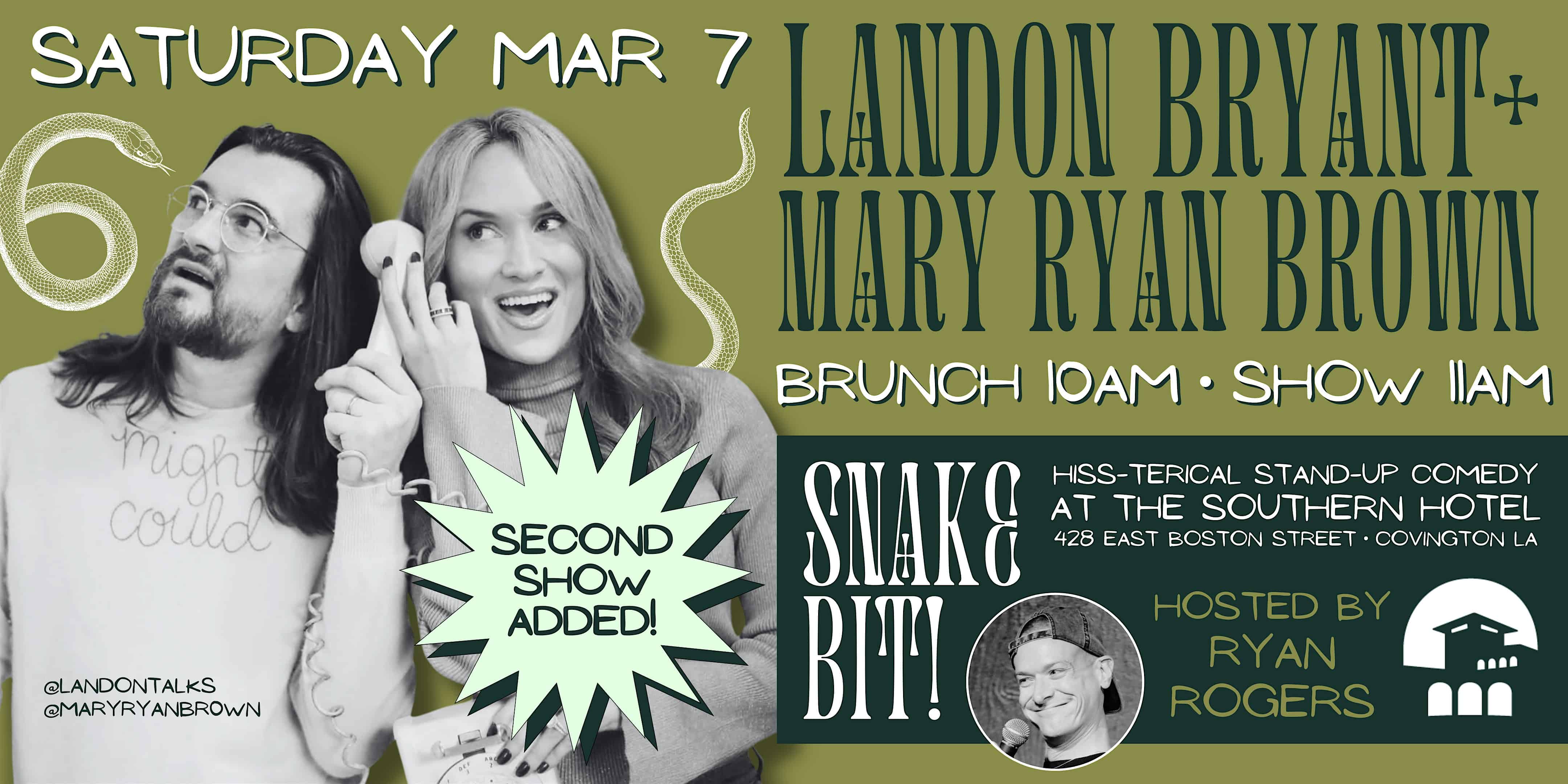 by admin14Feb Snake Bit! Brunch and Comedy Show at Southern Hotel at Southern Hotel – Covington, LA Snake Bit! Brunch and Comedy Show at Southern Hotel at Southern Hotel – Covington, LA 2 2 people viewed this event. Get snake-bit by the laughs. Landon Talks & Mary Ryan Brown live at Southern Hotel. Ticket includes brunch buffet + comedy show. Tickets-RSVP Link Date And Time Saturday, March 7th, 2026 05:00 PM (PST) Venue Southern Hotel Location 428 East Boston Street, Covington, LA 70433 Event Types Concert or PerformancePerforming & Visual Arts Event Category Louisiana Share With Friends Facebook Twitter Linkedin Xing Pinterest Share This Post: