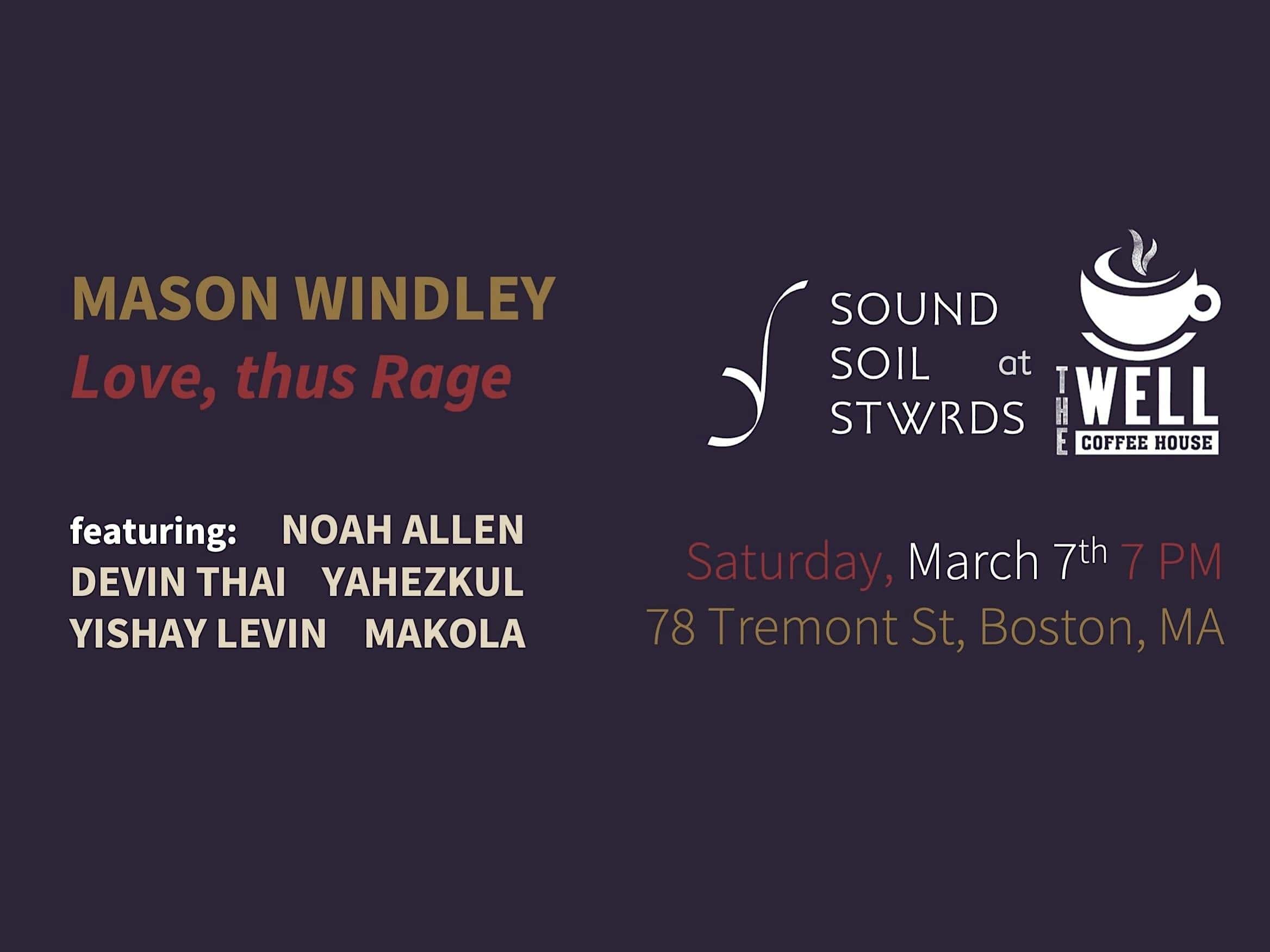 by admin23Feb Sound Soil Stwrds at The Well: Mason Windley at 78 Tremont St – Boston, MA Sound Soil Stwrds at The Well: Mason Windley at 78 Tremont St – Boston, MA 2 2 people viewed this event. In collaboration with The Well Coffee House, Sound Soil Stwrds presents Mason Windley and his new project “Love, thus Rage” Tickets-RSVP Link Date And Time Saturday, March 7th, 2026 07:00 PM (PST) Venue 78 Tremont St Location 78 Tremont Street, Boston, MA 2108 Event Types Music Event Category BostonMassachusetts Share With Friends Facebook Twitter Linkedin Xing Pinterest Share This Post: