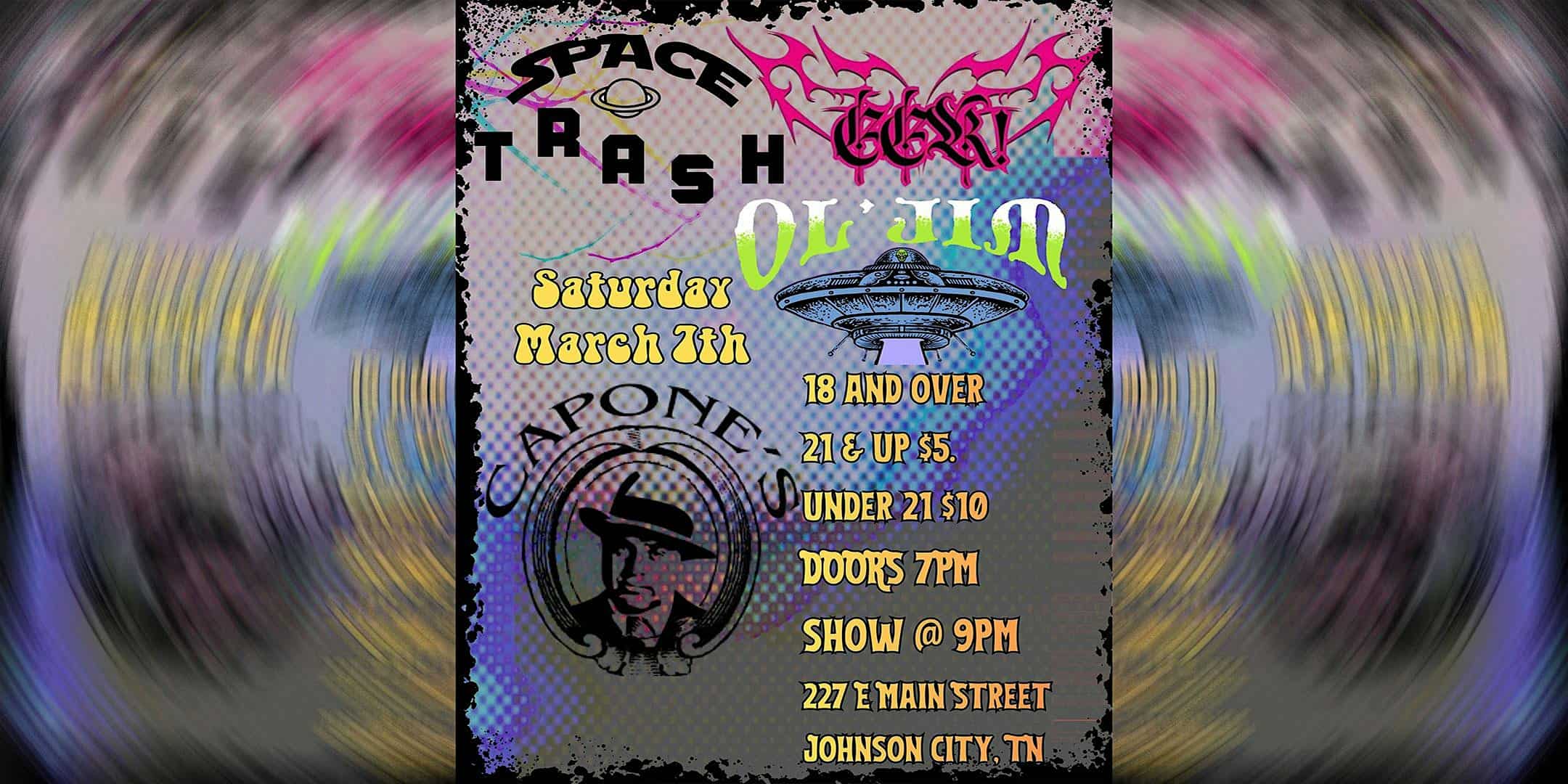 by admin23Feb Space Trash | EEK | OL’ Jim at Capone’s – Johnson City, TN Space Trash | EEK | OL’ Jim at Capone’s – Johnson City, TN 1 1 people viewed this event. Live Music Tickets-RSVP Link Date And Time Saturday, March 7th, 2026 09:00 PM (PST) Venue Capone's Location 227 E. Main St, Johnson City, TN 37604 Event Types Concert or PerformanceMusic Event Category Tennessee Share With Friends Facebook Twitter Linkedin Xing Pinterest Share This Post: