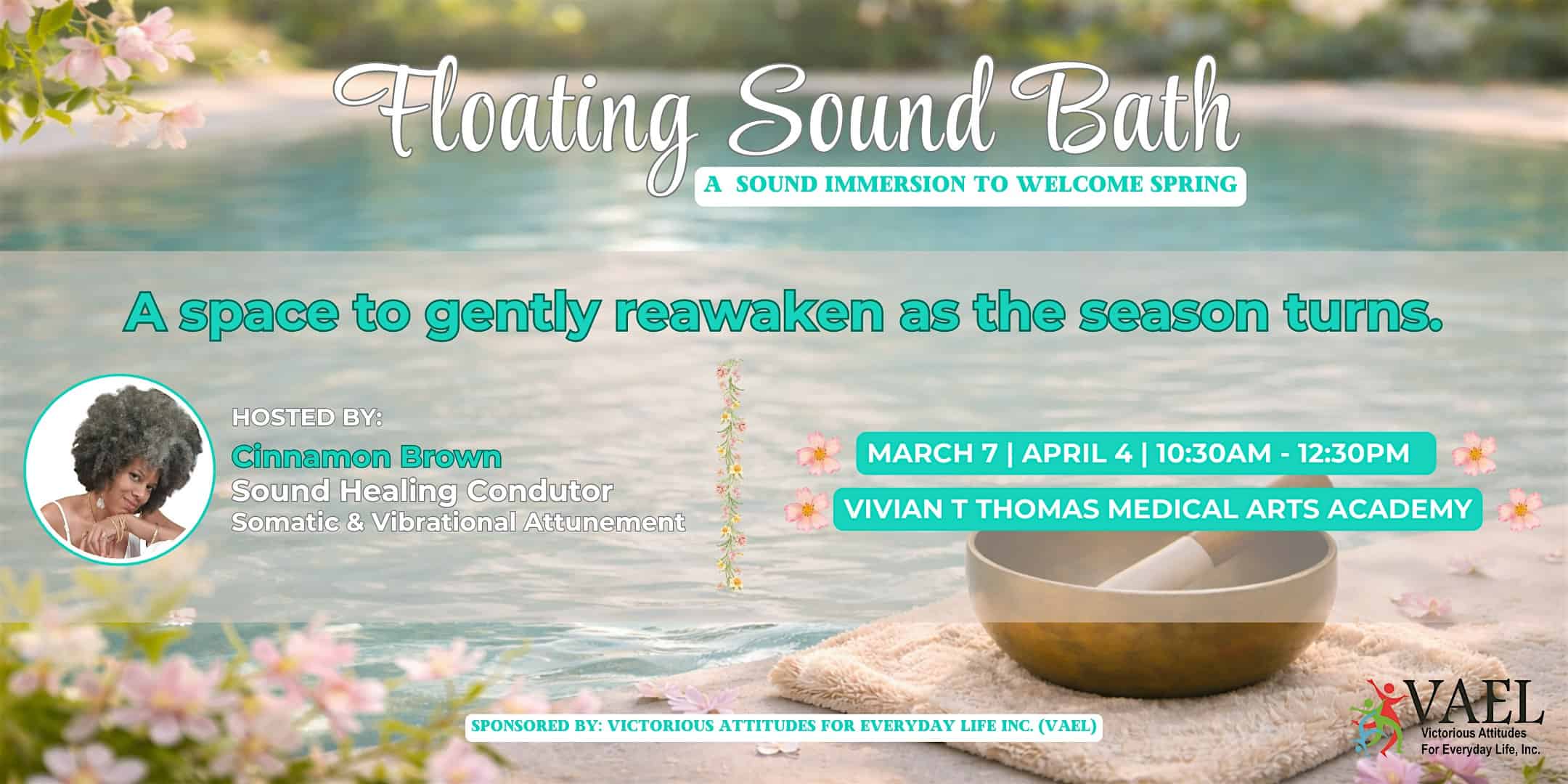 by admin14Feb Spring Floating Sound Bath at Vivien T. Thomas Medical Arts Academy – Baltimore, MD Spring Floating Sound Bath at Vivien T. Thomas Medical Arts Academy – Baltimore, MD 2 2 people viewed this event. Come relax and unwind as you float in a pool while listening to soothing sounds during our monthly Floating Sound Bath events! Tickets-RSVP Link Date And Time Saturday, March 7th, 2026 03:00 PM (PST) Venue Vivien T. Thomas Medical Arts Academy Location 100 North Calhoun Street, Baltimore, MD 21223 Event Types Concert or Performance Event Category BaltimoreMaryland Share With Friends Facebook Twitter Linkedin Xing Pinterest Share This Post: