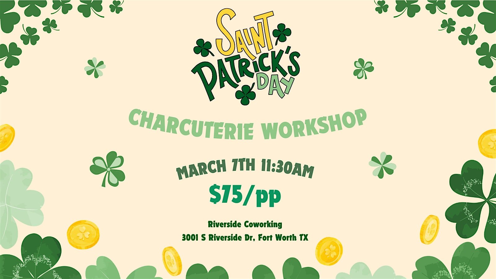 by admin27Feb St Patrick’s Day Themed Charcuterie Workshop at Riverside Coworking, Kitchens & Studios – Fort Worth, TX St Patrick’s Day Themed Charcuterie Workshop at Riverside Coworking, Kitchens & Studios – Fort Worth, TX 1 1 people viewed this event. Celebrate St. Patrick’s Day with a festive twist on charcuterie. This hands-on workshop will guide you through building a beautiful board. Tickets-RSVP Link Date And Time Saturday, March 7th, 2026 11:00 AM (PST) Venue Riverside Coworking, Kitchens & Studios Location 3001 South Riverside Drive, Fort Worth, TX 76119 Event Types Food & Drink Event Category Fort WorthTexas Share With Friends Facebook Twitter Linkedin Xing Pinterest Share This Post: