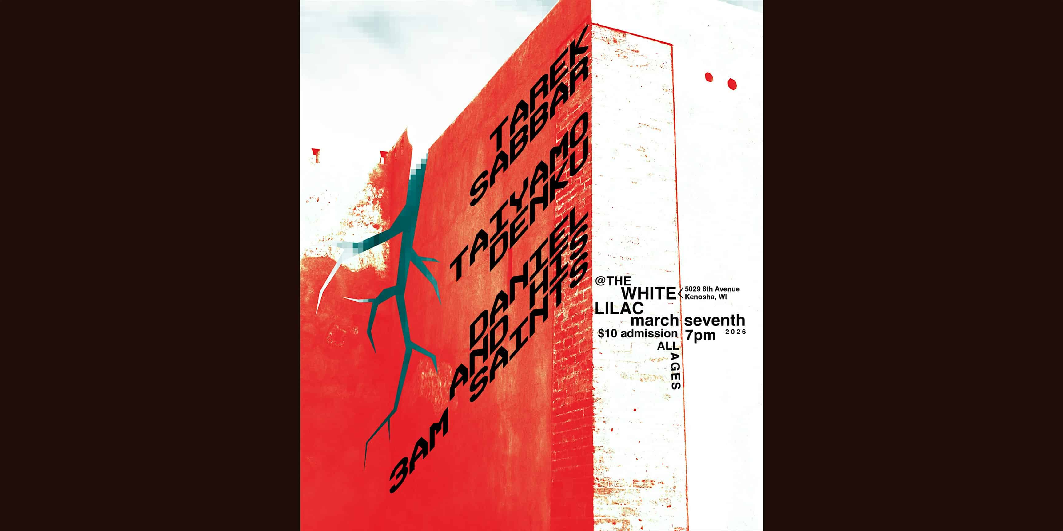 by admin23Feb Taiyamo Denku, Daniel & His 3AM Saints and Tarek Sabbar at The White Lilac, 6th Avenue, Kenosha, WI, USA – Kenosha, WI Taiyamo Denku, Daniel & His 3AM Saints and Tarek Sabbar at The White Lilac, 6th Avenue, Kenosha, WI, USA – Kenosha, WI 1 1 people viewed this event. Folk soul, conscious hip-hop & hypnotic techno collide at White Lilac. Tickets-RSVP Link Date And Time Saturday, March 7th, 2026 07:00 PM (PST) Venue The White Lilac, 6th Avenue, Kenosha, WI, USA Location 5029 6th Avenue, Kenosha, WI 53140 Event Types Concert or PerformanceMusic Event Category Wisconsin Share With Friends Facebook Twitter Linkedin Xing Pinterest Share This Post:
