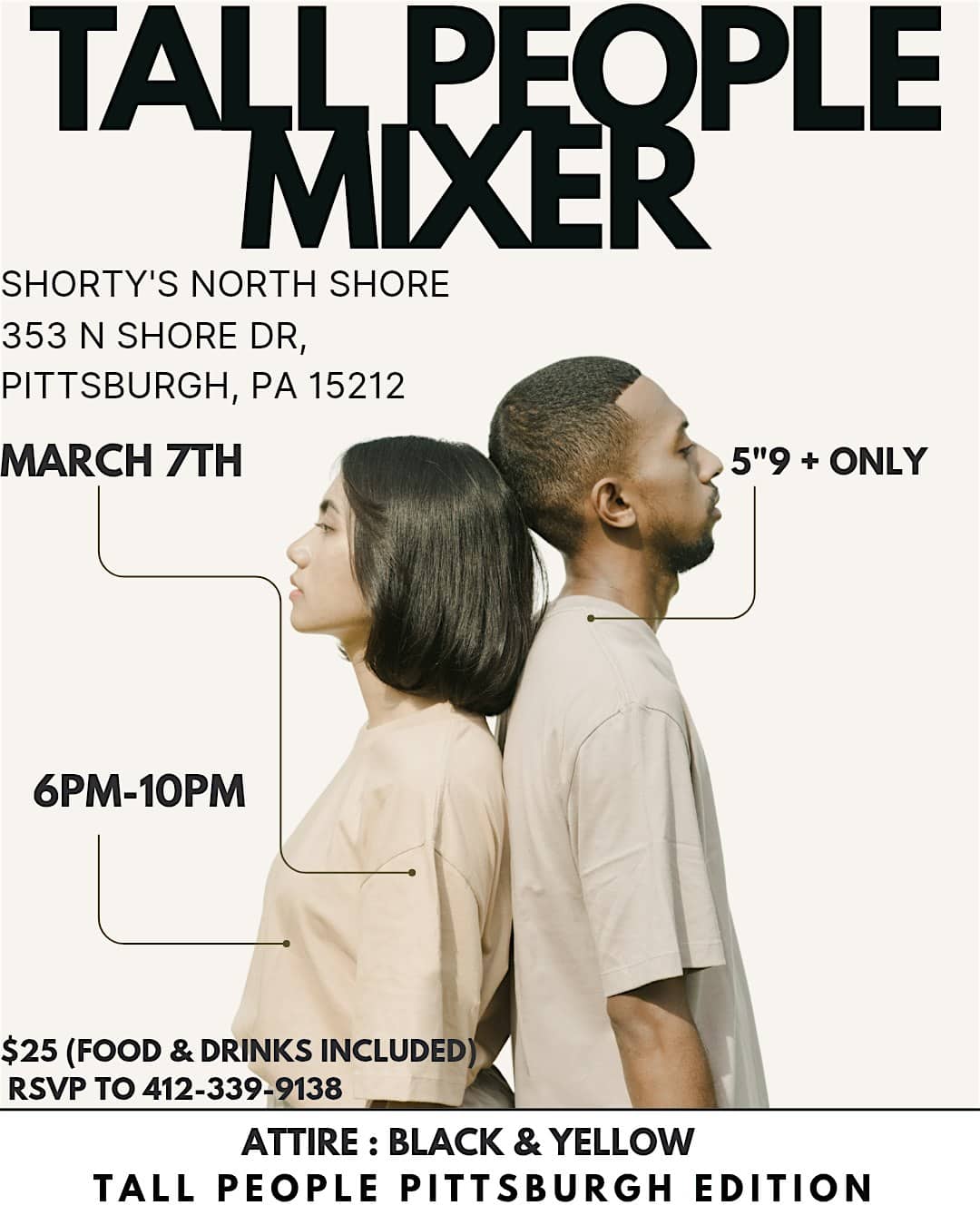 by admin23Feb TALL PEOPLE MIXER at Shorty’s Pins x Pints – Pittsburgh, PA TALL PEOPLE MIXER at Shorty’s Pins x Pints – Pittsburgh, PA 2 2 people viewed this event. Meet tall folks, share laughs, and enjoy a chill hangout made just for the towering crowd! Tickets-RSVP Link Date And Time Saturday, March 7th, 2026 @ 06:00 PM Location 353 North Shore Drive, Pittsburgh, PA 15212 Event Types Community & CultureParty or Social Gathering Event Category PennsylvaniaPittsburgh Share With Friends Facebook Twitter Linkedin Xing Pinterest Share This Post: