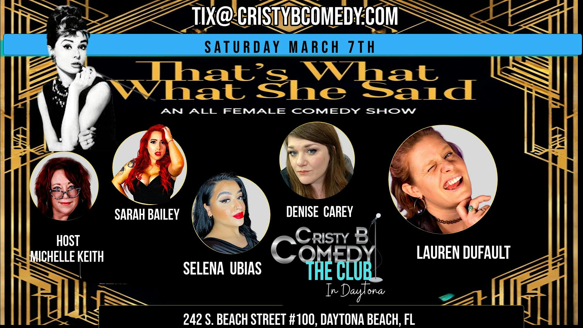 by admin05Mar “That’s What She Said” An All Female Comedy Show at 242 S Beach St #100 – Daytona Beach, FL “That’s What She Said” An All Female Comedy Show at 242 S Beach St #100 – Daytona Beach, FL 1 1 people viewed this event. Who says women aren’t funny? Come and see what these hilarious ladies are bringing for the funny! Tickets-RSVP Link Date And Time Saturday, March 7th, 2026 06:00 PM (PST) Venue 242 S Beach St #100 Location 242 South Beach Street, Daytona Beach, FL 32114 Event Types Concert or PerformancePerforming & Visual Arts Event Category Daytona BeachFlorida Share With Friends Facebook Twitter Linkedin Xing Pinterest Share This Post: