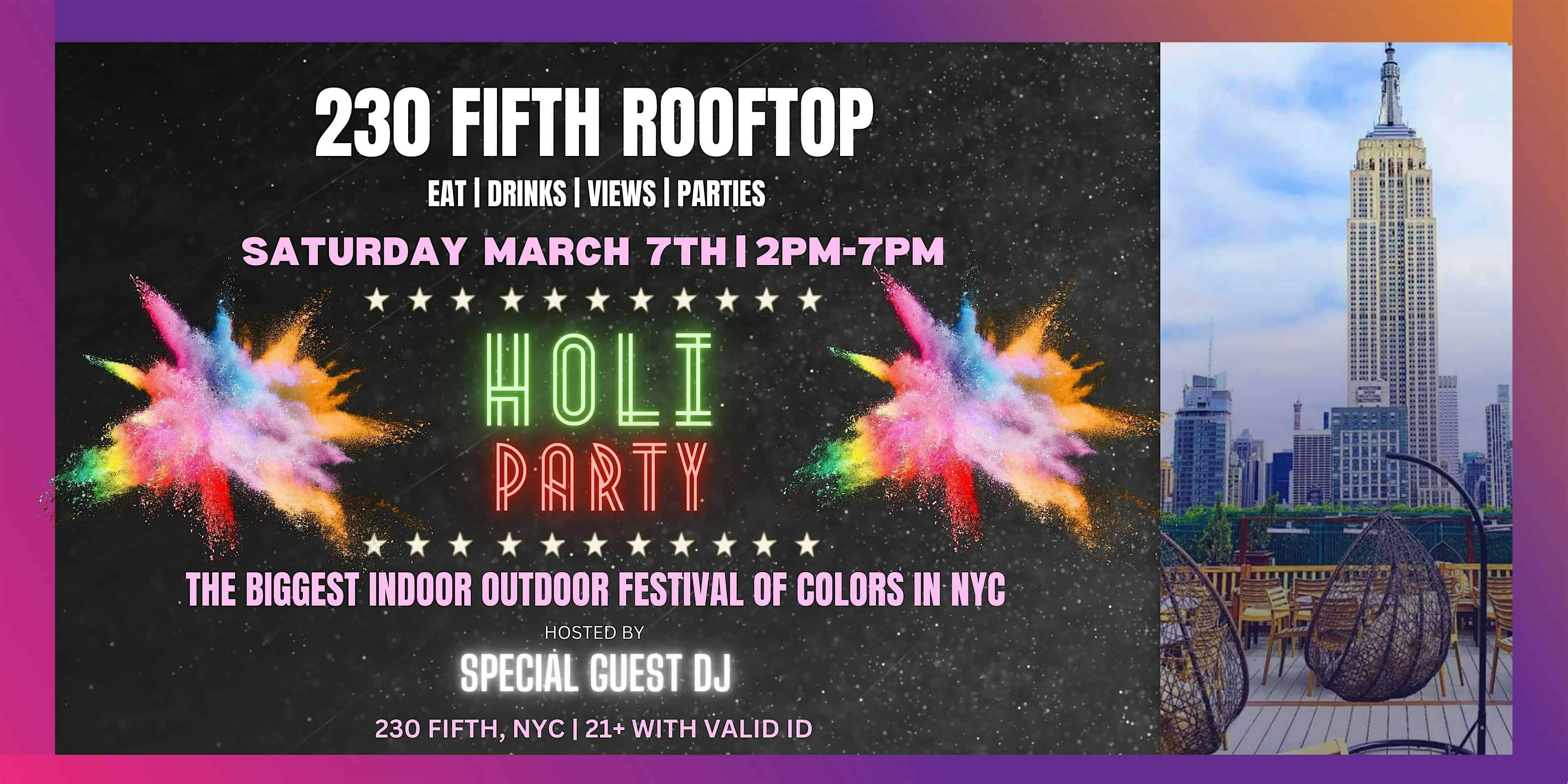 by admin23Feb THE ANNUAL HOLI FEST @ 230 FIFTH – RANG DE NEW YORK 2026 at 230 Fifth Rooftop Bar – New York, NY THE ANNUAL HOLI FEST @ 230 FIFTH – RANG DE NEW YORK 2026 at 230 Fifth Rooftop Bar – New York, NY 1 1 people viewed this event. A Colorful Affair at The 230 Fifth — Celebrate Holi with music, dance, drinks, and color at NYC’s biggest & most famous rooftop bar! Tickets-RSVP Link Date And Time Saturday, March 7th, 2026 02:00 PM (PST) Venue 230 Fifth Rooftop Bar Location 1150 Broadway, New York, NY 10001 Event Types Party or Social Gathering Event Category New YorkNew York City Share With Friends Facebook Twitter Linkedin Xing Pinterest Share This Post: