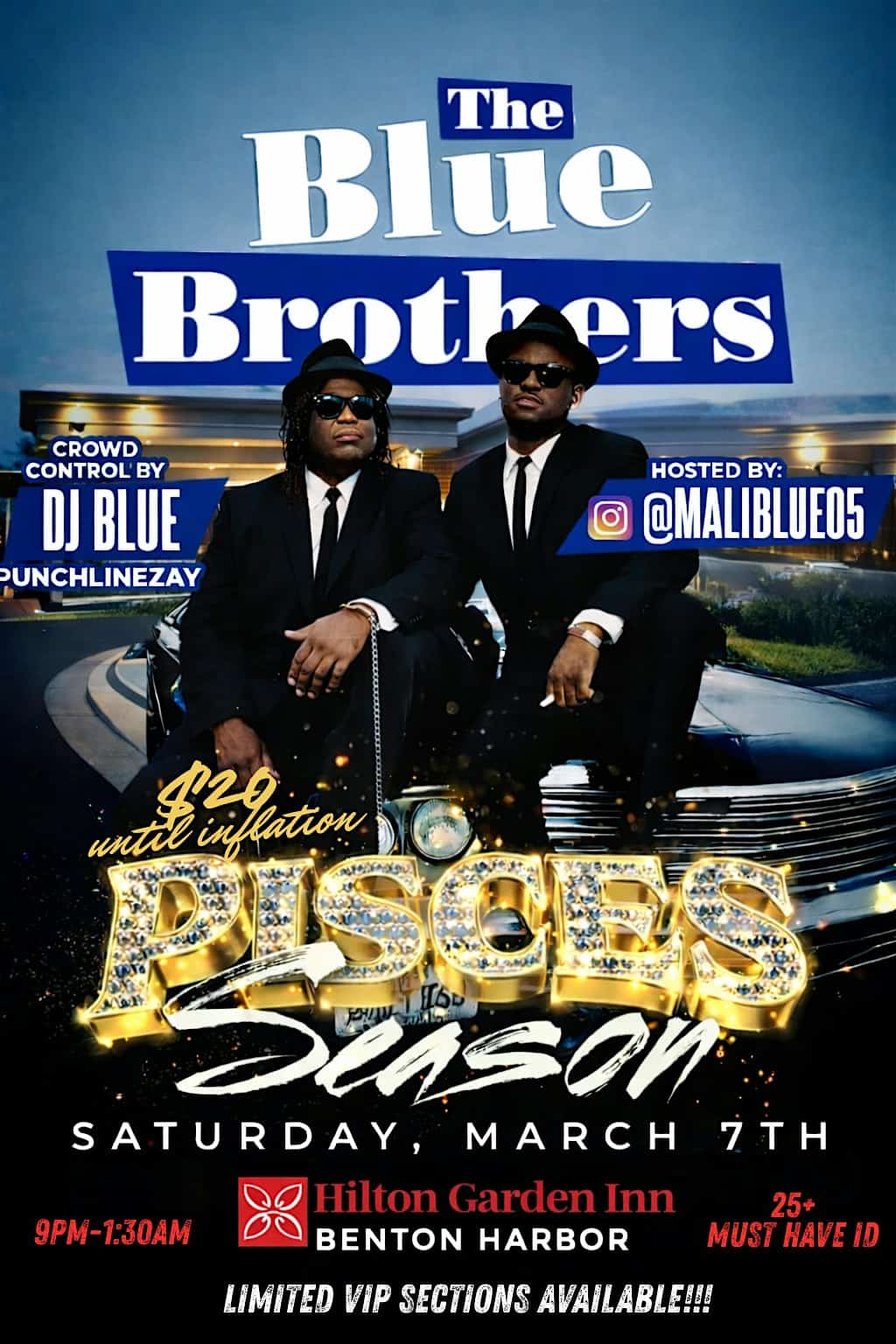 by admin23Feb The Blue Brothers Pisces Season at Hilton Garden Inn Benton Harbor / St. Joseph – Benton Harbor, MI The Blue Brothers Pisces Season at Hilton Garden Inn Benton Harbor / St. Joseph – Benton Harbor, MI 1 1 people viewed this event. PISCES SEASON IS HERE!!! IYKYK Tickets-RSVP Link Date And Time Saturday, March 7th, 2026 @ 09:00 PM Location 1300 Cinema Way, Benton Harbor, MI 49022 Event Types MusicParty or Social Gathering Event Category Michigan Share With Friends Facebook Twitter Linkedin Xing Pinterest Share This Post: