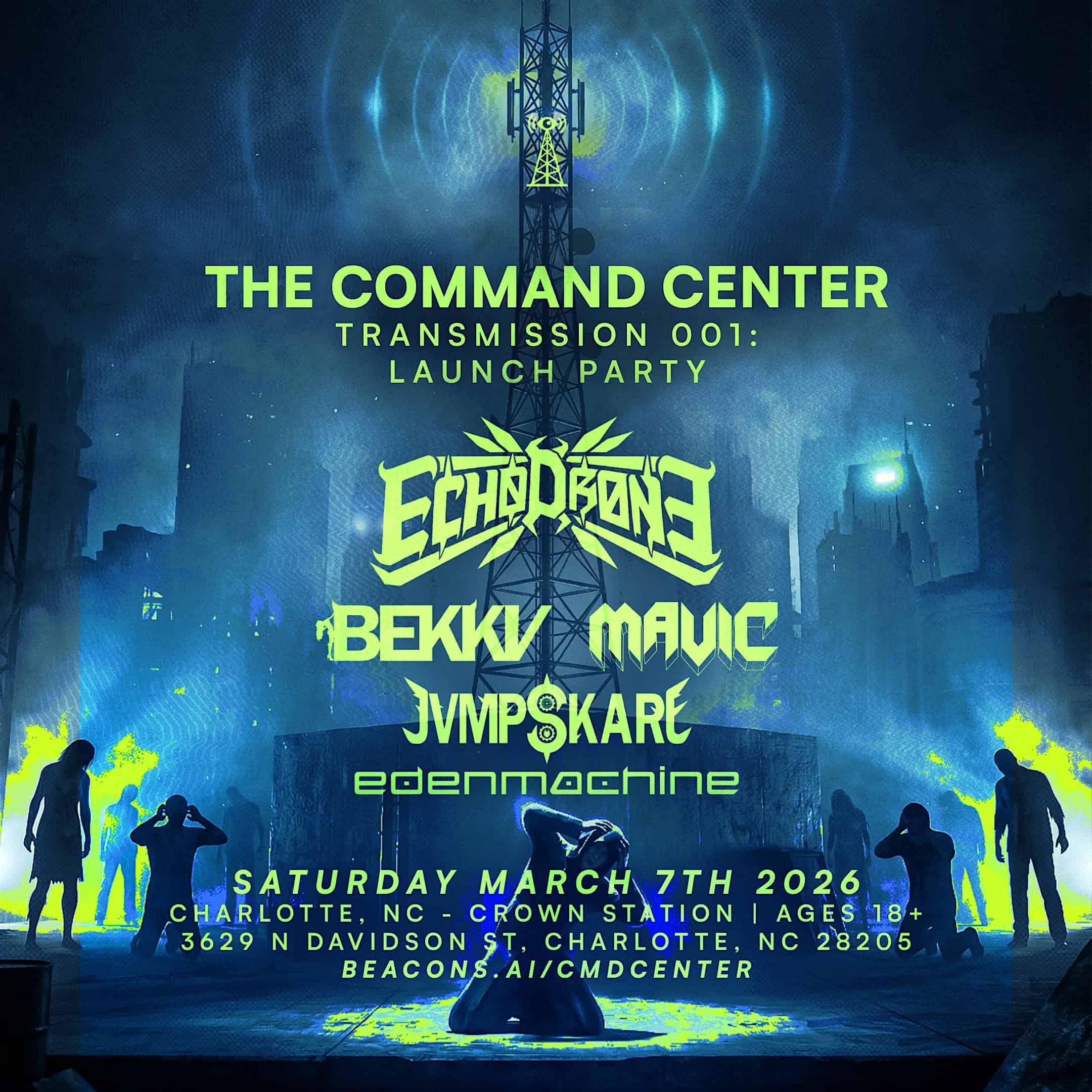 by admin23Feb The Command Center Transmission 001: Launch Party at CROWN STATION Coffee House & Pub – Charlotte, NC The Command Center Transmission 001: Launch Party at CROWN STATION Coffee House & Pub – Charlotte, NC 2 2 people viewed this event. The Command Center Transmission 001 launches a new bass music label with a night of dubstep and underground energy in Charlotte, NC. Tickets-RSVP Link Date And Time Saturday, March 7th, 2026 08:00 PM (PST) Venue CROWN STATION Coffee House & Pub Location 3629 North Davidson Street, Charlotte, NC 28205 Event Types Concert or PerformanceMusic Event Category CharlotteNorth Carolina Share With Friends Facebook Twitter Linkedin Xing Pinterest Share This Post: