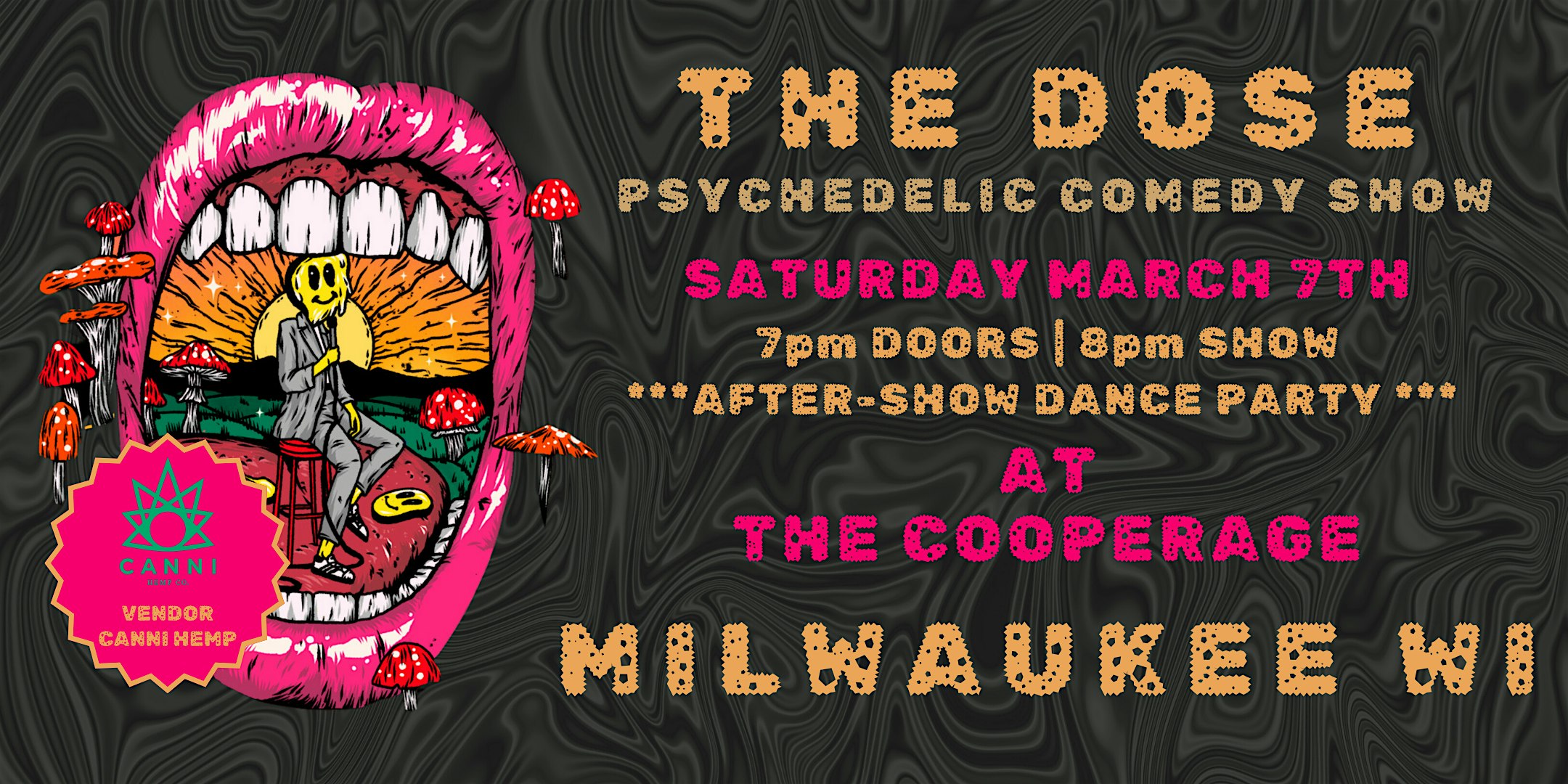 by admin05Mar THE DOSE: A PSYCHEDELIC COMEDY SHOW at The Cooperage – Milwaukee, WI THE DOSE: A PSYCHEDELIC COMEDY SHOW at The Cooperage – Milwaukee, WI 1 1 people viewed this event. A mind-bending journey of experimentation, laughter, and healing. THE DOSE is a vibrant and fully immersive psychedelic comedy experience. Tickets-RSVP Link Date And Time Saturday, March 7th, 2026 07:00 PM (PST) Venue The Cooperage Location 822 South Water Street, Milwaukee, WI 53204 Event Types Concert or PerformancePerforming & Visual Arts Event Category MilwaukeeWisconsin Share With Friends Facebook Twitter Linkedin Xing Pinterest Share This Post: