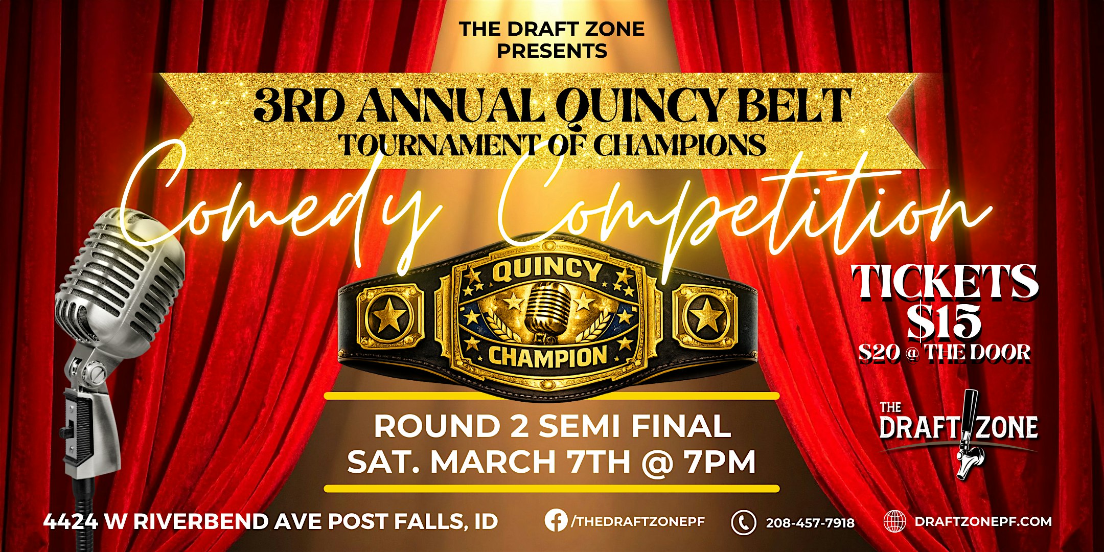 by admin05Mar The Draft Zone Presents The Quincy Belt Comedy Competition Semifinal #2 at The Draft Zone – Post Falls, ID The Draft Zone Presents The Quincy Belt Comedy Competition Semifinal #2 at The Draft Zone – Post Falls, ID 2 2 people viewed this event. Comedy competition of the best up-and-coming comics of the PNW. 2nd of 4 semifinals in the Quincy Belt Tournament of Champions! Tickets-RSVP Link Date And Time Saturday, March 7th, 2026 07:00 PM (PST) Venue The Draft Zone Location 4436 West Riverbend Avenue, Post Falls, ID 83854 Event Types Concert or PerformancePerforming & Visual Arts Event Category Idaho Share With Friends Facebook Twitter Linkedin Xing Pinterest Share This Post:
