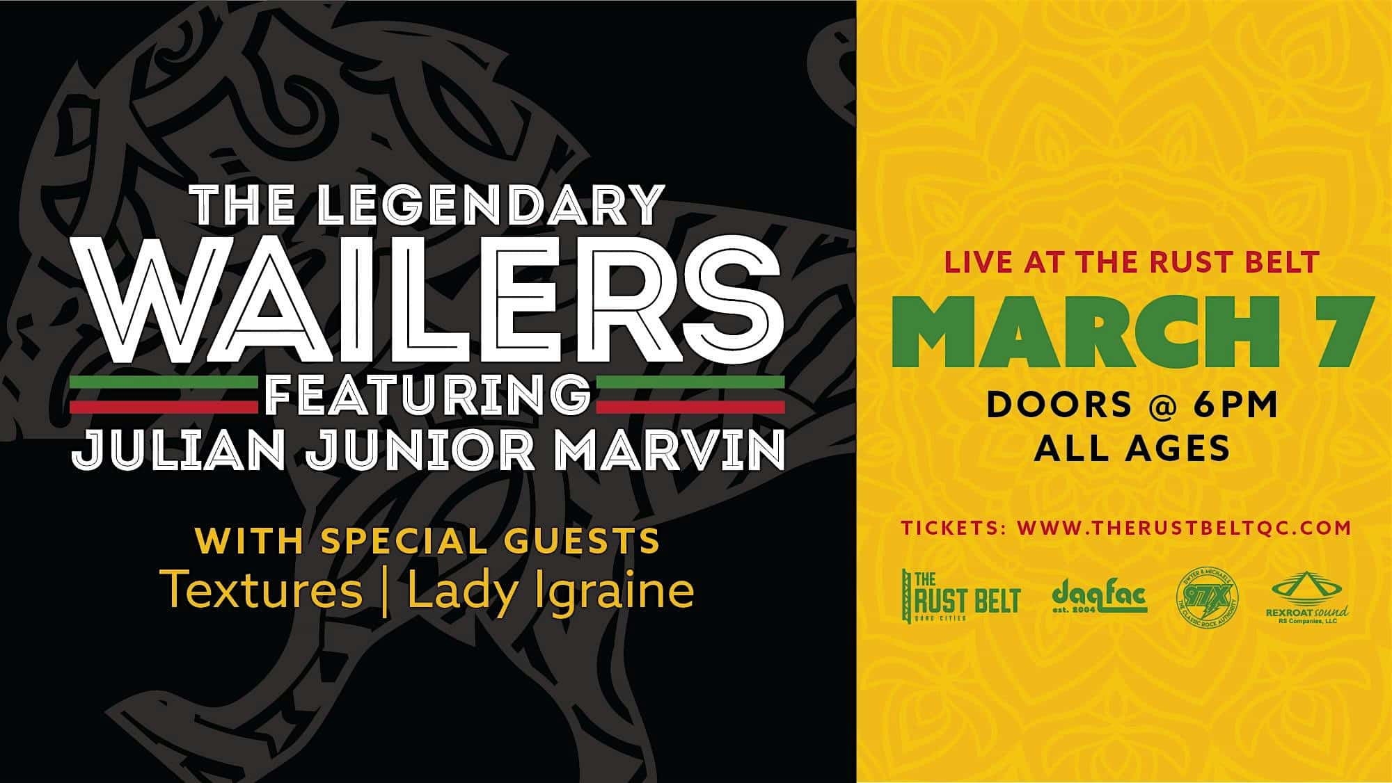 by admin23Feb The Legendary Wailers featuring Julian Junior Marvin at The Rust Belt – East Moline, IL The Legendary Wailers featuring Julian Junior Marvin at The Rust Belt – East Moline, IL 2 2 people viewed this event. The Legendary Wailers featuring Julian Junior Marvin playing the best of Bob Marley the way it was intended Sat, March 7 at The Rust Belt Tickets-RSVP Link Date And Time Saturday, March 7th, 2026 07:00 PM (PST) Venue The Rust Belt Location 533 12th Ave, East Moline, IL 61244 Event Types Concert or PerformanceMusic Event Category Illinois Share With Friends Facebook Twitter Linkedin Xing Pinterest Share This Post: