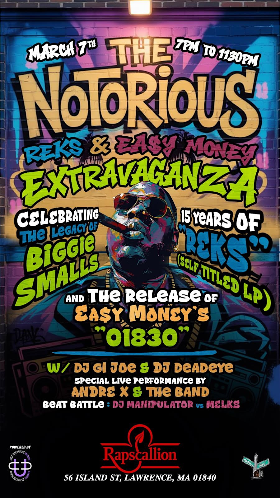by admin23Feb The Notorious REKS & Easy Money Extravaganza at Rapscallion Brick Oven Pizza and Brewery – Lawrence, MA The Notorious REKS & Easy Money Extravaganza at Rapscallion Brick Oven Pizza and Brewery – Lawrence, MA 2 2 people viewed this event. A night celebrating the legacy of Biggie Smalls & 15 years of REKS (self titled LP) plus the release of Easy Money’s “01830” Tickets-RSVP Link Date And Time Saturday, March 7th, 2026 07:00 PM (PST) Venue Rapscallion Brick Oven Pizza and Brewery Location 56 Island Street, Lawrence, MA 1840 Event Types Concert or PerformanceMusic Event Category Massachusetts Share With Friends Facebook Twitter Linkedin Xing Pinterest Share This Post: