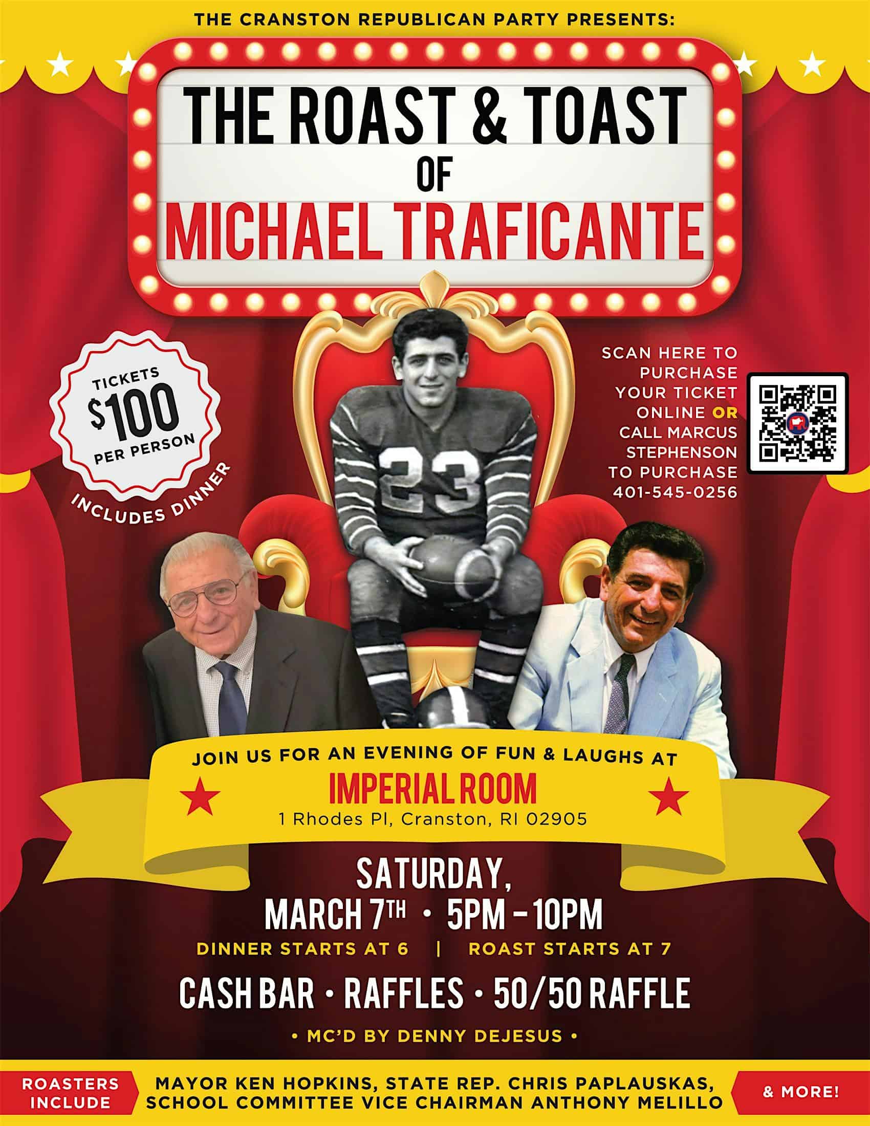 by admin23Feb The Roast of Michael Traficante at Imperial Room – Cranston, RI The Roast of Michael Traficante at Imperial Room – Cranston, RI 2 2 people viewed this event. Get ready for laughs and burns at The Roast of Michael Traficante, live and in person! Tickets-RSVP Link Date And Time Saturday, March 7th, 2026 @ 05:00 PM Location 1 Rhodes Place, Cranston, RI 2905 Event Types Party or Social GatheringPerforming & Visual Arts Event Category ProvidenceRhode Island Share With Friends Facebook Twitter Linkedin Xing Pinterest Share This Post: