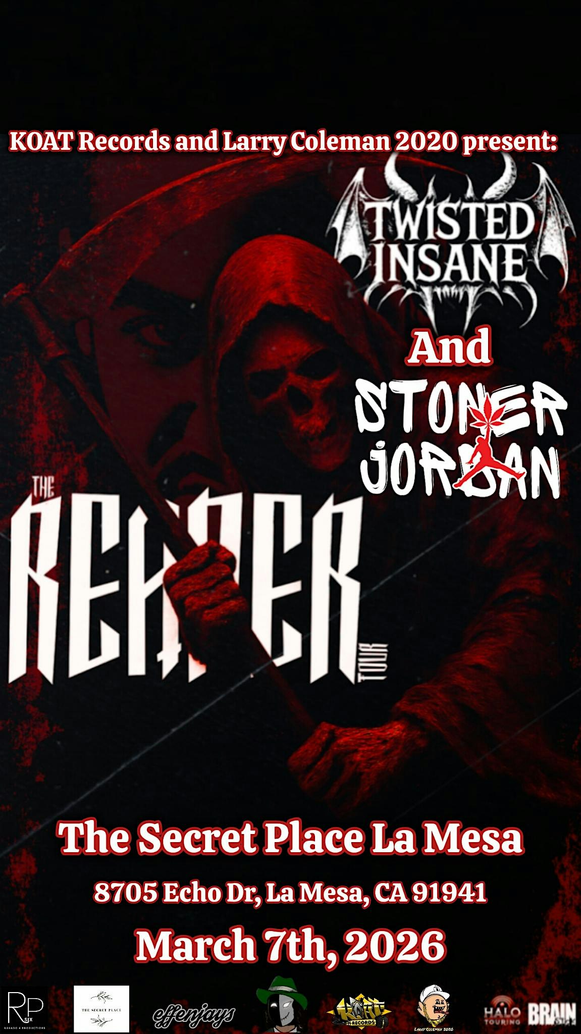 by admin27Feb Twisted Insane : Reaper Tour (San Diego) at The Secret Place La Mesa – La Mesa, CA Twisted Insane : Reaper Tour (San Diego) at The Secret Place La Mesa – La Mesa, CA 2 2 people viewed this event. Get ready San Diego, Twsisted Insane is bringing the Reaper Tour for a wild, in-person night! Tickets-RSVP Link Date And Time Saturday, March 7th, 2026 05:00 PM (PST) Venue The Secret Place La Mesa Location 8705 Echo Drive, La Mesa, CA 91941 Event Types Concert or PerformanceMusic Event Category CaliforniaSan Diego Share With Friends Facebook Twitter Linkedin Xing Pinterest Share This Post:
