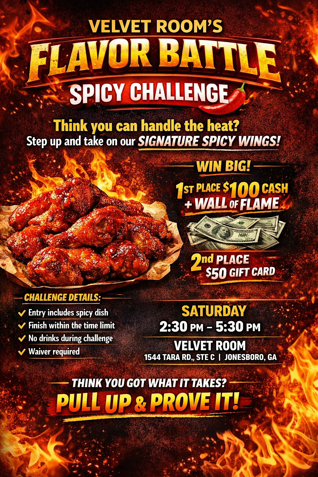 by admin27Feb Velvet Room Flavor Battle : Spicy Challenge at Velvet Room – Jonesboro, GA Velvet Room Flavor Battle : Spicy Challenge at Velvet Room – Jonesboro, GA 2 2 people viewed this event. Get ready to spice things up and battle it out in the Velvet Room Flavor Battle: Spicy Challenge! Tickets-RSVP Link Date And Time Saturday, March 7th, 2026 @ 02:00 PM Location 1544 Tara Road, Jonesboro, GA 30238 Event Types Food & DrinkParty or Social Gathering Event Category Georgia Share With Friends Facebook Twitter Linkedin Xing Pinterest Share This Post: