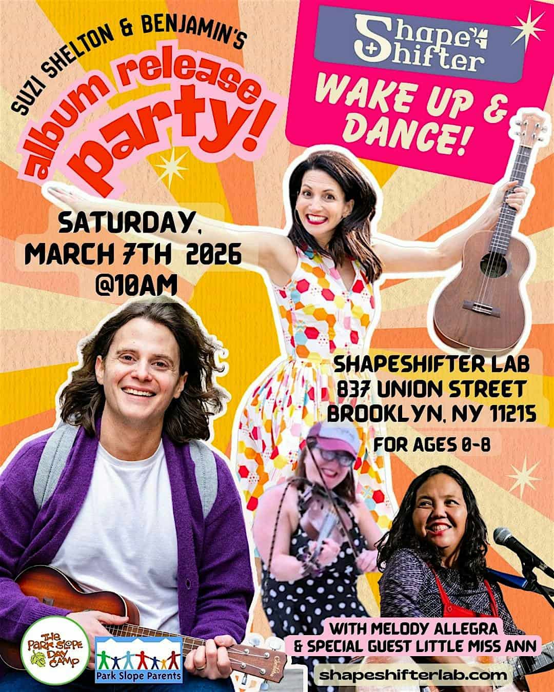 by admin14Feb Wake Up & Dance with Suzi Shelton & Benjamin ALBUM RELEASE PARTY! at ShapeShifter Lab – Brooklyn, NY Wake Up & Dance with Suzi Shelton & Benjamin ALBUM RELEASE PARTY! at ShapeShifter Lab – Brooklyn, NY 2 2 people viewed this event. Families, get ready to sing, dance, and celebrate friendship! Join us for a joyful Wake Up & Dance Indoor Concert! Tickets-RSVP Link Date And Time Saturday, March 7th, 2026 03:00 PM (PST) Venue ShapeShifter Lab Location 837 Union Street, Brooklyn, NY 11215 Event Types Concert or PerformanceMusic Event Category New York Share With Friends Facebook Twitter Linkedin Xing Pinterest Share This Post:
