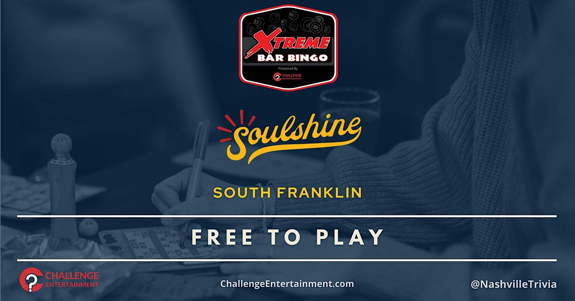 by admin27Feb Weekly Xtreme Bar Bingo at Soulshine Pizza – South Franklin at Soulshine Pizza – Franklin, TN Weekly Xtreme Bar Bingo at Soulshine Pizza – South Franklin at Soulshine Pizza – Franklin, TN 1 1 people viewed this event. Weekly Xtreme Bar Bingo at Soulshine Pizza – South Franklin Tickets-RSVP Link Date And Time Saturday, March 7th, 2026 08:00 PM (PST) Venue Soulshine Pizza Location 4021 Hughes Crossing, Franklin, TN 37064 Event Types Food & Drink Event Category Tennessee Share With Friends Facebook Twitter Linkedin Xing Pinterest Share This Post:
