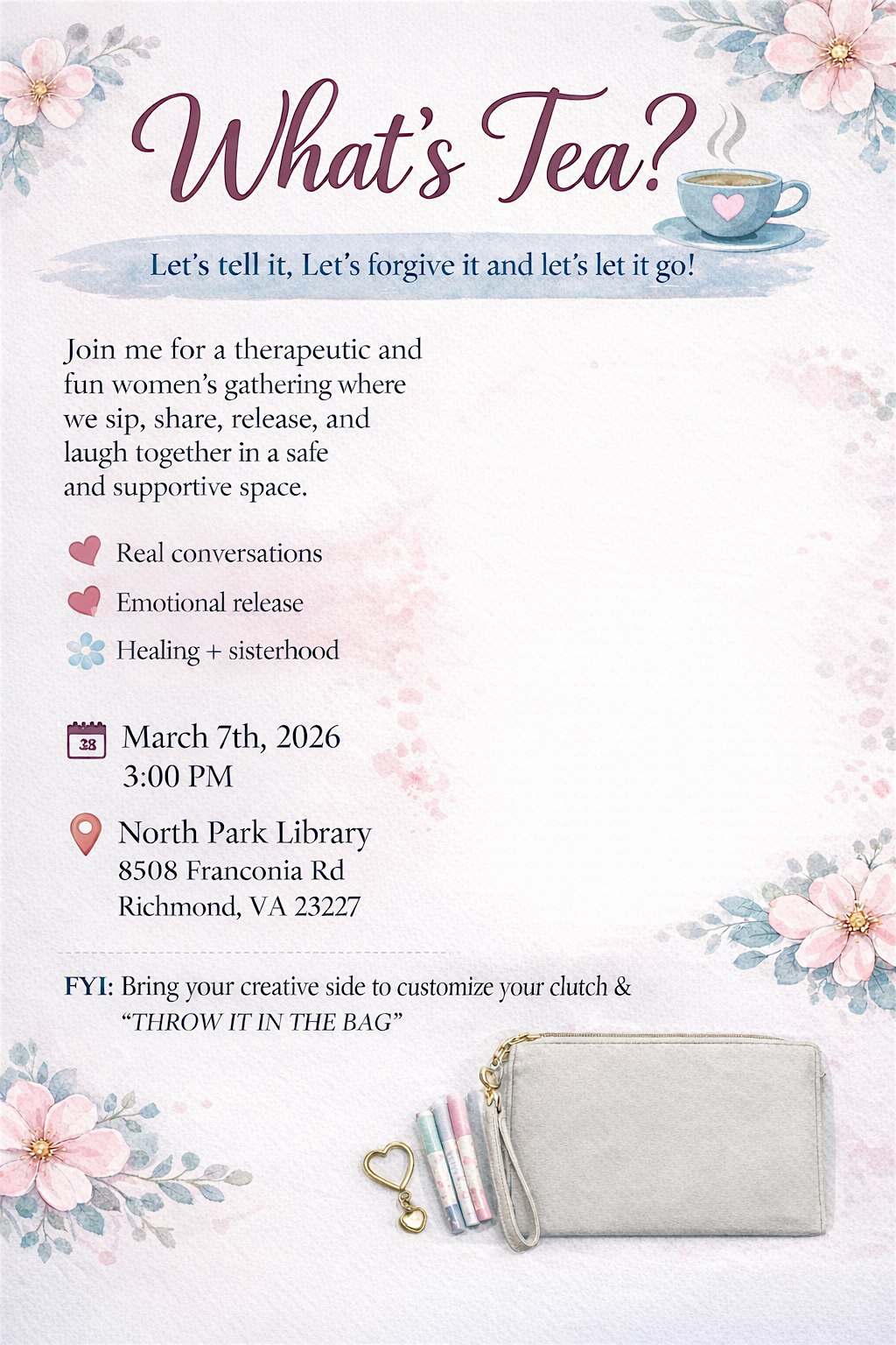 by admin23Feb What’s Tea at North Park – Henrico County Public Library – Richmond, VA What’s Tea at North Park – Henrico County Public Library – Richmond, VA 2 2 people viewed this event. An event for the ladies to get together to fellowship, eat, laugh and cry if need be. Testimonials of how we overcame and will never go back Tickets-RSVP Link Date And Time Saturday, March 7th, 2026 @ 02:00 PM Location 8508 Franconia Road, Richmond, VA 23227 Event Types Community & CultureParty or Social Gathering Event Category Virginia Share With Friends Facebook Twitter Linkedin Xing Pinterest Share This Post: