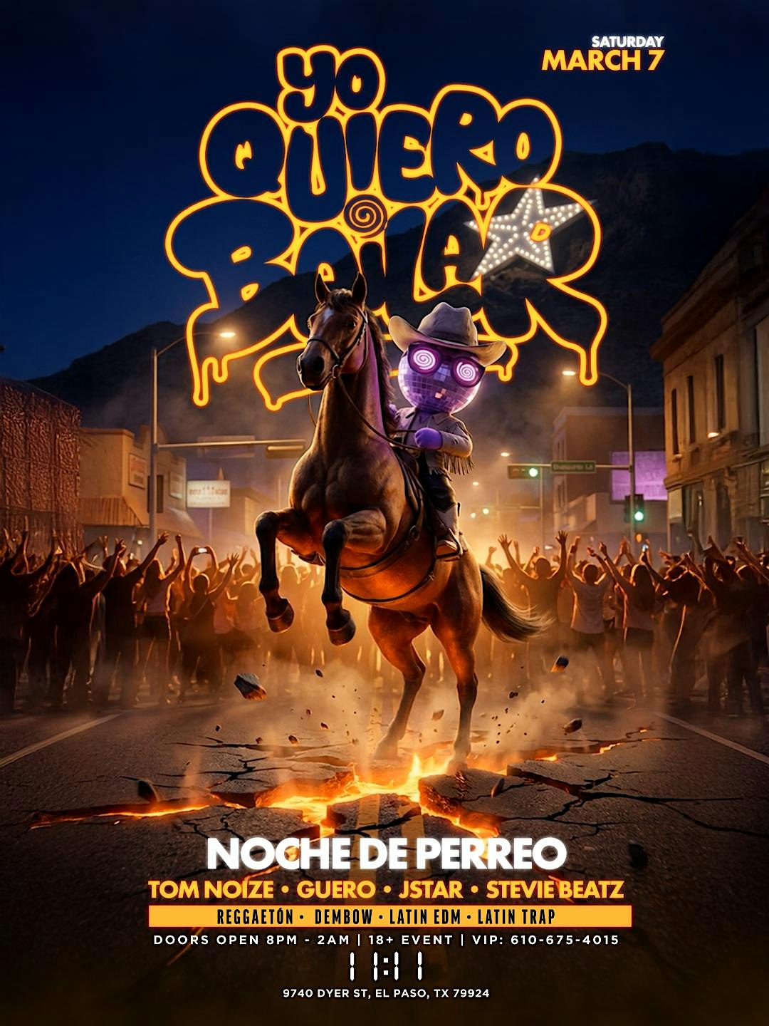 by admin23Feb Yo Quiero Bailar Fest @ 11:11: El Paso, Texas at 11:11 EP TX – El Paso, TX Yo Quiero Bailar Fest @ 11:11: El Paso, Texas at 11:11 EP TX – El Paso, TX 3 3 people viewed this event. EL PASO GET READY !! – YO QUIERO BAILAR @ 11:11 !! The #1 Reggaeton Mega Festival on the Planet Earth Lands in the heart of Texas !! Tickets-RSVP Link Date And Time Saturday, March 7th, 2026 08:00 PM (PST) Venue 11:11 EP TX Location 9740 Dyer Street, El Paso, TX 79924 Event Types MusicParty or Social Gathering Event Category El PasoTexas Share With Friends Facebook Twitter Linkedin Xing Pinterest Share This Post: